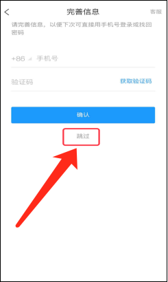 (2)完善信息处,请务必点击 “跳过” !(特别提醒:不要输入手机号获取验证码)
