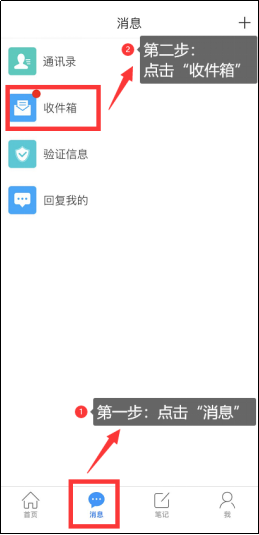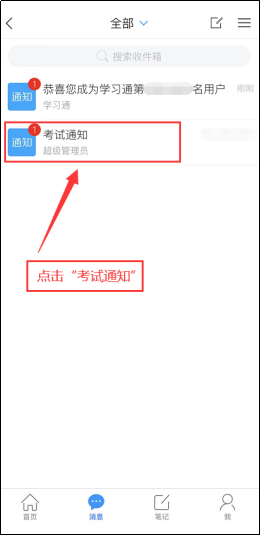 1.点击最下方“消息”,消息栏中选择“收件箱”;查找所报考的对应学校发布“考试通知”,点击进入;