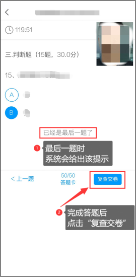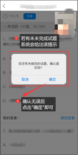5.核查作答情况时,可修改选择答案;确认无误后,点击最上方的“交卷”按钮,并确认提交。(若存在未作答题目,系统会提示,请注意核查!)
