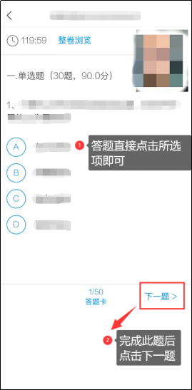 4.开始答题并交卷:每题选择正确答案点击该选项即可,点击右下角“下一题”继续作答;直到最后一题时系统会提示“已经是最后一题了”,可点击“复查交卷”进行答题情况核查。