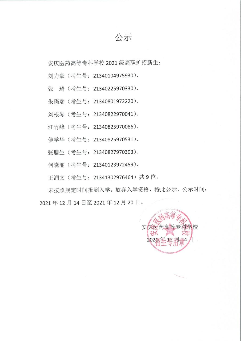 2021级高职扩招新生放弃入学资格公示
