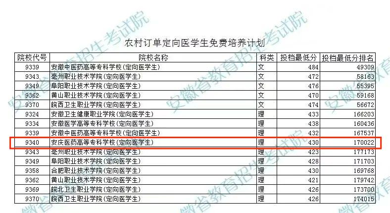 7月16日,安徽省提前批次高职专科院校开始录取,今年会提前批免费医学定向生计划招收25人(理科),首轮投档最高分459分,最低分为430分(全省排名170022),投档人数25人。
