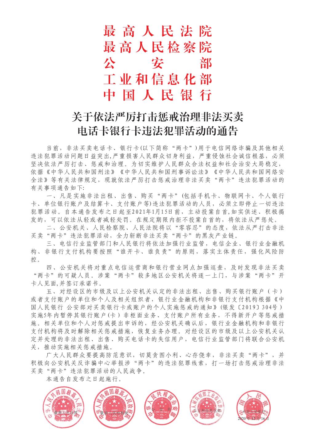 关于依法严厉打击惩戒治理非法买卖电话卡银行卡违法犯罪活动的通告