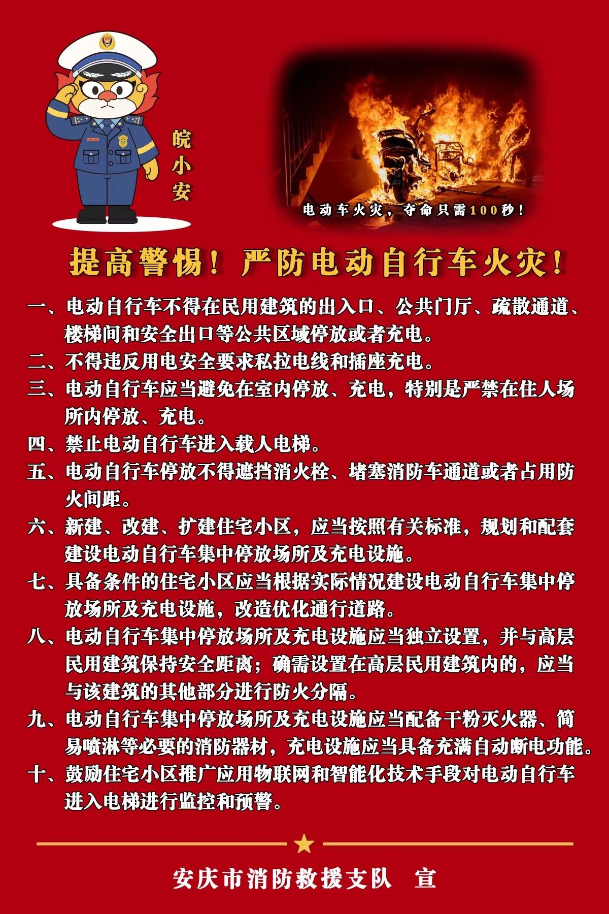 安庆市消防安全委员会办公室关于居民住宅小区电动自行车停放充电“五个严禁”的通告