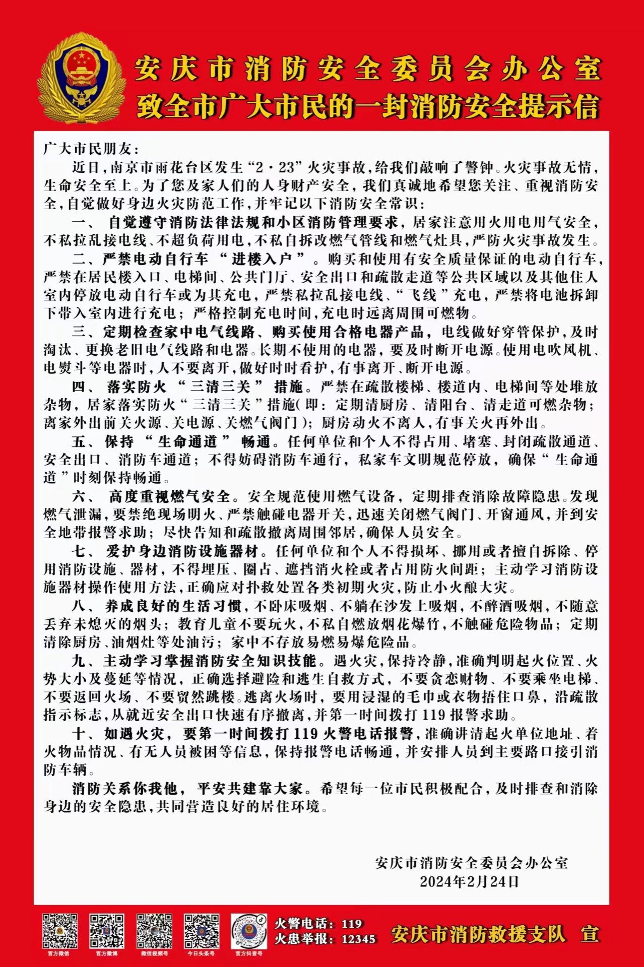 安庆市消防安全委员会办公室致全市广大市民的一封消防安全提示信