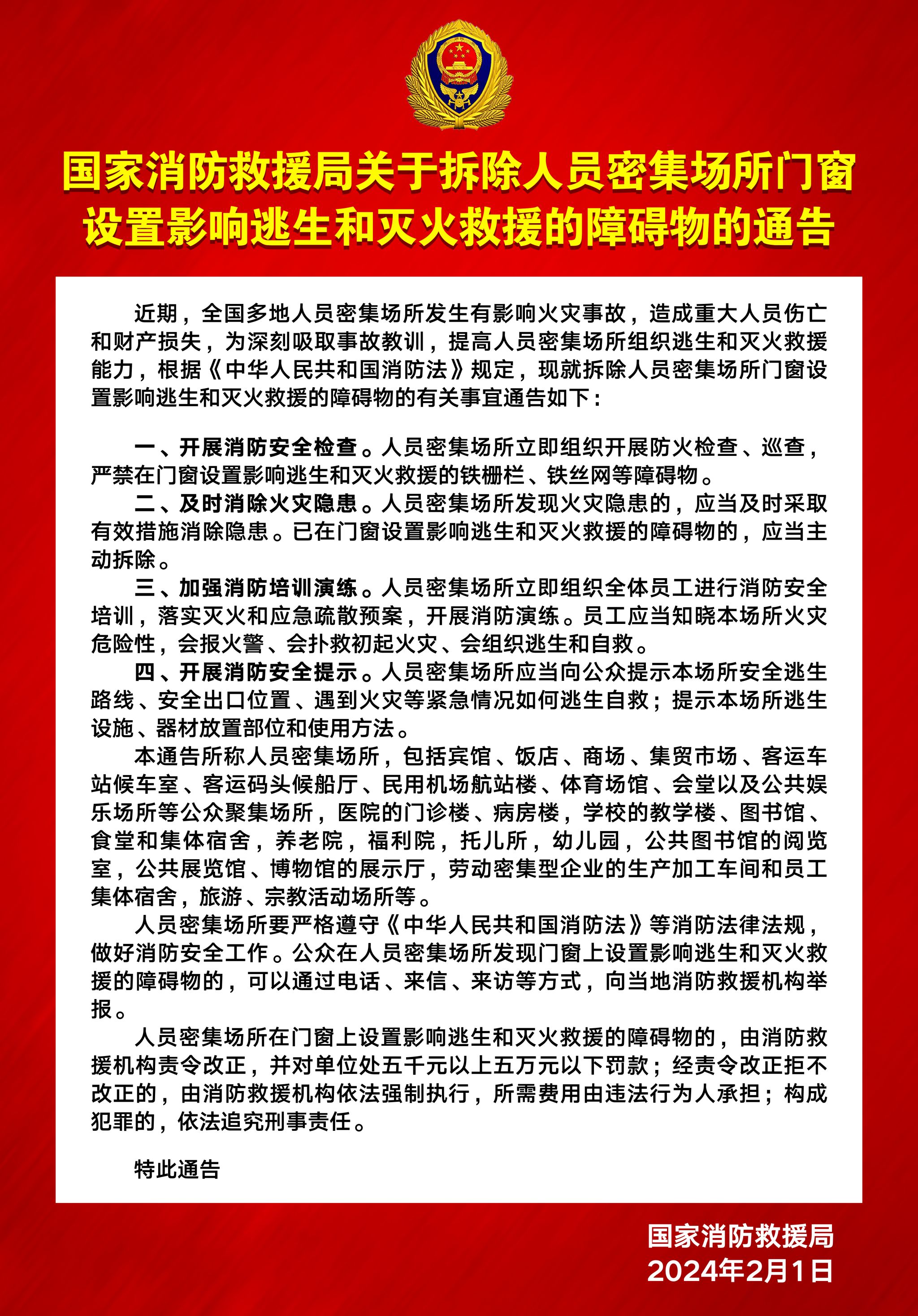 国家消防救援局关于拆除人员密集场所门窗设置影响逃生和灭火救援的障碍物的通告
