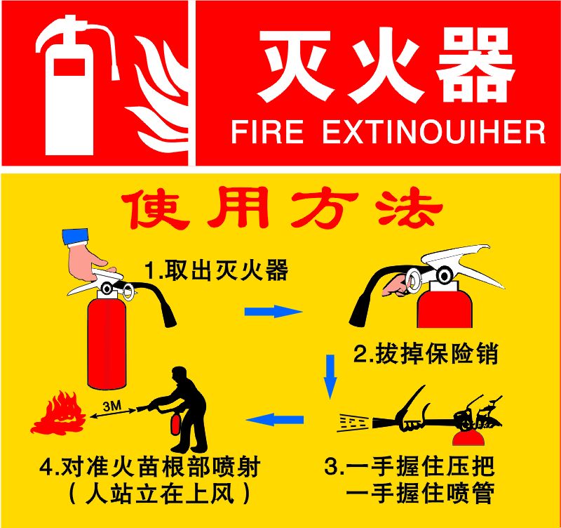 先拔掉保险销,一手握住喷嘴对准火点,另一手压下压把。干粉灭火器最常用的开启方法为压把法。将灭火器提到距火源适当位置后,先上下颠倒几次,使筒内的干粉松动,然后让喷嘴对准燃烧最猛烈处,拔去保险销,压下压把,灭火剂便会喷出灭火。开启干粉灭火棒时,左手握住其中部,将喷嘴对准火焰根部,右手拔掉保险卡,旋转开启旋钮,打开贮气瓶,滞时1-4秒,干粉便会喷出灭火。