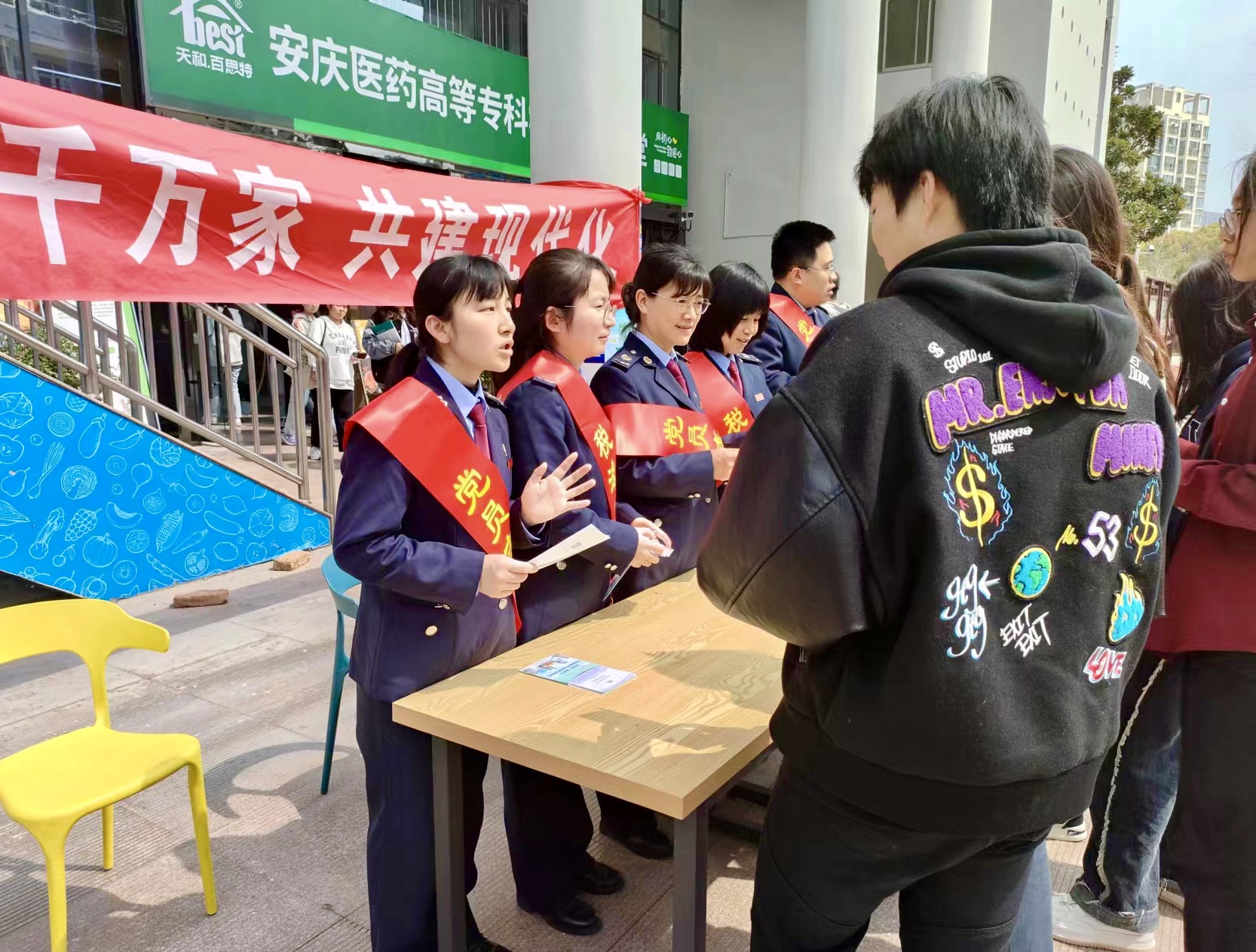 税法宣传员和党员志愿者们在学校人流量大的公共区域设立税收政策咨询台,向往来的学生发放“高校毕业生创业就业税收优惠政策”宣传手册,支持鼓励高校毕业生就业创业,学生反响十分热烈。(撰稿、供图:檀啸;审改:陈琪)