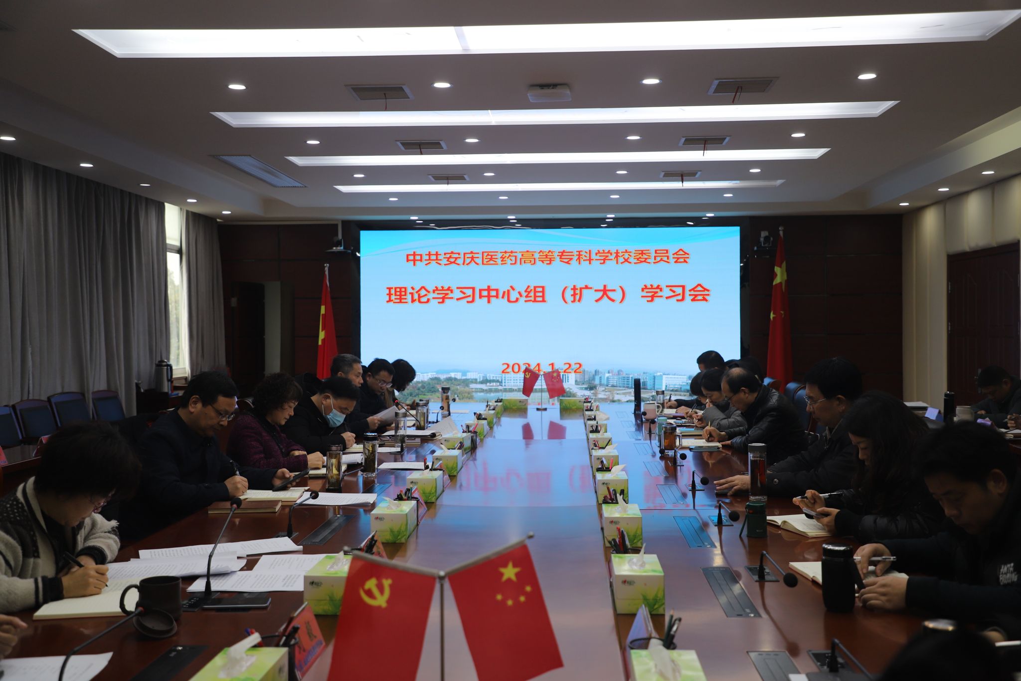 1月22日上午,校党委召开理论学习中心组(扩大)学习会议,校党委书记叶林霞主持会议并讲话,党委副书记、校长朱庆丰,党委副书记张仕庆,纪委书记陈燚,党委委员朱三九、朱雯、陈琪、刘毅出席会议,直属附院、各学院、处室、中心负责人参加会议。