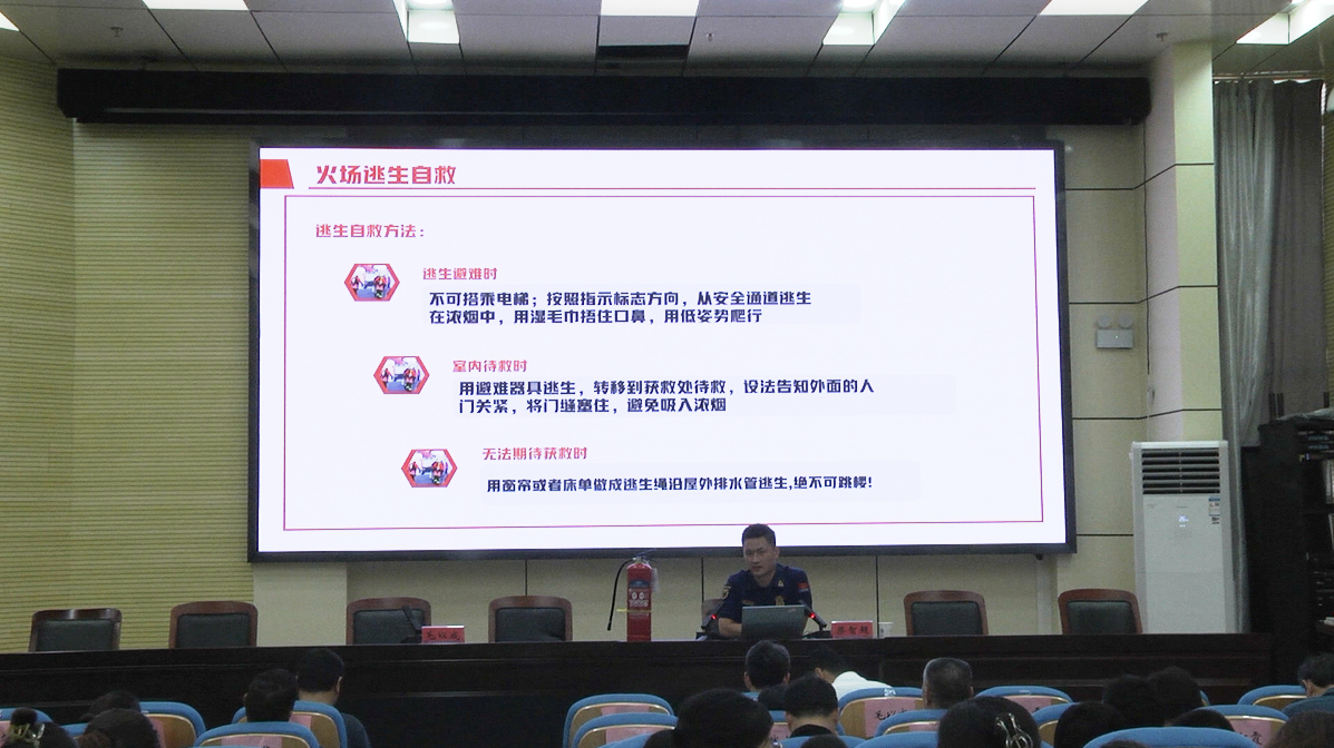 安庆市宜秀区消防救援大队政治指导员梁智超作题为《学校消防安全管理》的报告。他通过简短的视频短片,阐明了校园安全管理的重要性,并用通俗易懂的语言告知如何在火灾中求救和自救。