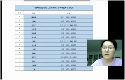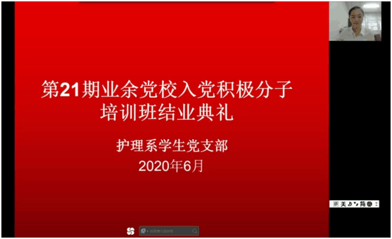 2020年6月22日下午2点,护理系第21期业余党校入党积极分子培训班结业典礼在线上举行。出席开班典礼的有:护理系党总支副书记、主任胡忠亚,系党总支副书记曹承娇,系学生支部书记洪宝珍以及总支和支部的其他委员。典礼由班主任马文娜主持。