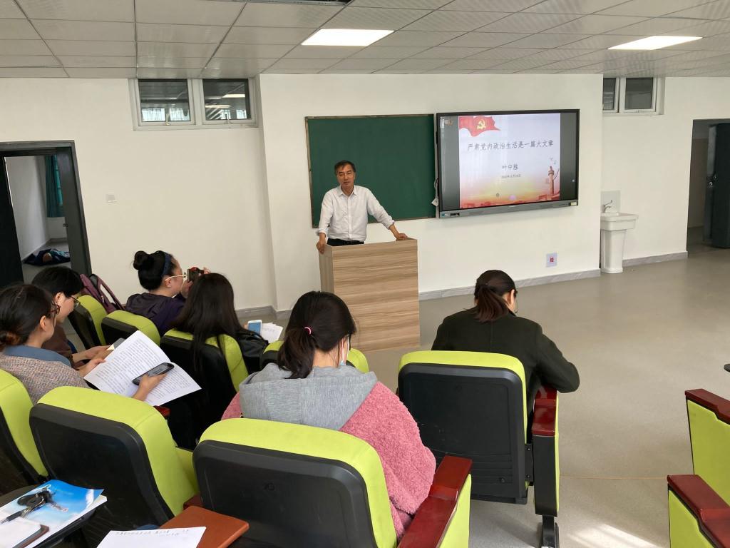 党课以“严肃党内政治生活是一篇大文章”为题。叶中胜带领党员老师学习了《关于新形势下党内政治生活的若干准则》。《新准则》系统总结了近年来尤其是党的十八大以来全面从严治党的新举措、新经验、新成果,形成了新的制度安排。《新准则》明确了新形势下加强和规范党内政治生活的方向、目标、原则、任务、举措,从12个方面做出具体规定,为我们进一步严肃党内政治生活提供了基本遵循。