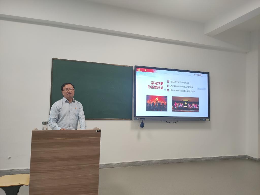 党课上,杨金奎围绕党史学习教育“为何学”、“学什么”和“怎么学”,阐述了党史学习教育最重要的几个内容。结合视频“中国共产党百年述职报告”,讲解了中国共产党的百年风雨历程,从“南陈北李,相约建党”到“延乔路短、集贤路长,他们都通往繁华大道”,列举了安徽省尤其安庆地区共产党人的先进事迹,鼓励在座师生树立正确的党史观,准确把握党的历史发展主题主线、主流本质,正确认识和科学评价党史上的重大事件、重要会议和重要人物,把握住历史发展规律和大势,顺势而为,奋发有为,为人民利益而奋斗。
