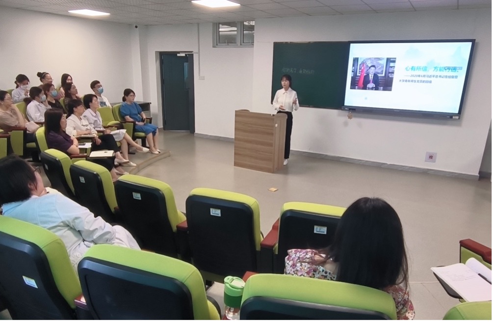 学习交流活动分为三个阶段。首先,由21级护理2班江繁和21级护理4班钟静同学为老师们上了一堂别开生面的思政课,她们围绕思政课程中的有关章节、专题,结合新时代新思想主题、迎接党的二十大、“四史”教育、抗击疫情等时事热点问题进行精彩讲解,教学手段形式多样,PPT课件制作精美,充分呈现了她们对课程的理解、吸收和运用。