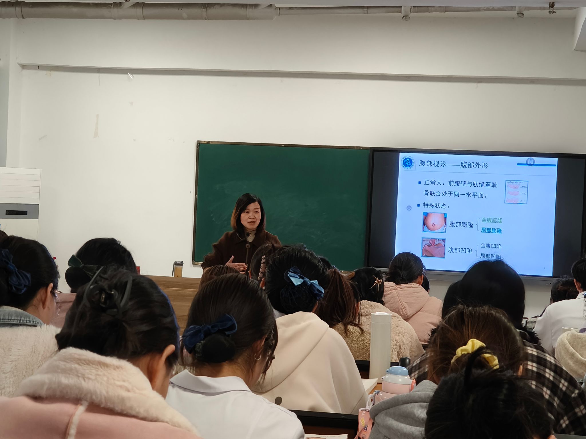 谢伦芳以 "腹部评估的临床思维构建" 为主题,结合临床实践,采用 "三阶梯教学法":通过 3D 虚拟解剖系统动态演示腹部器官毗邻关系,演示叩诊方法与技巧,结合真实病例解析评估要点与误区,训练学生们的临床思维。课堂设置 "评估手势纠错"" 阳性体征判别 "等互动环节,课堂气氛活跃,学生们纷纷参与。