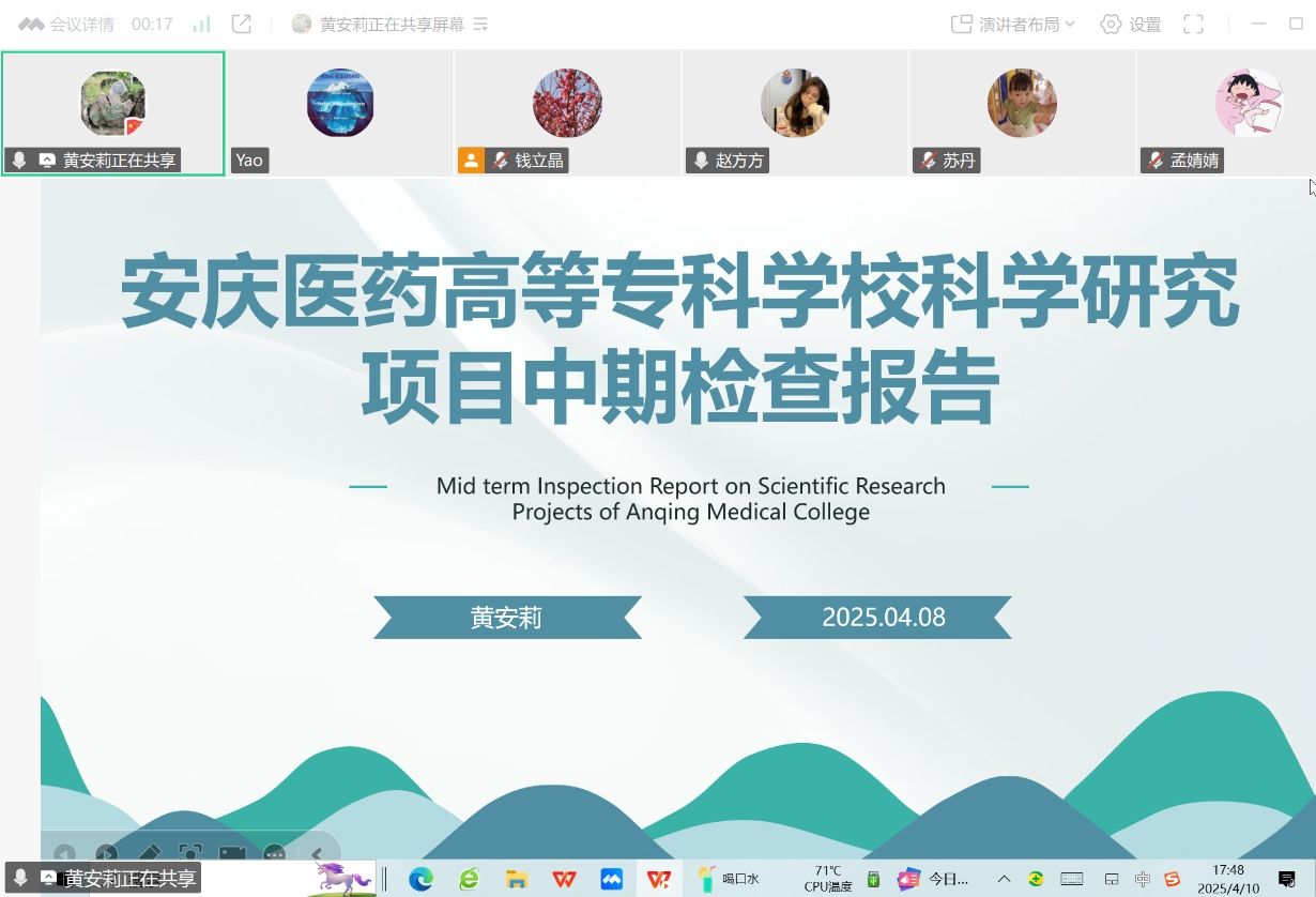 为贯彻落实安徽省教育厅及学校科研管理办法,强化科研项目过程管理,提升科研管理水平与项目建设质量,2025年4月10日下午,护理学院以线上形式成功举办2025年度科研项目汇报会。会议历时4小时,搭建起教师与专家的科研交流桥梁,助力课题研究提质升级。