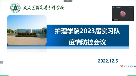 鉴于当前全国新冠肺炎疫情形势严峻复杂,为保证学生在实习期间安全平稳,护理学院于12月5日晚,召开了各实习队长疫情防控专题线上会议,护理学院院长钱立晶、副院长梁宇鸣参加会议,会议由学院实习管理老师主持。