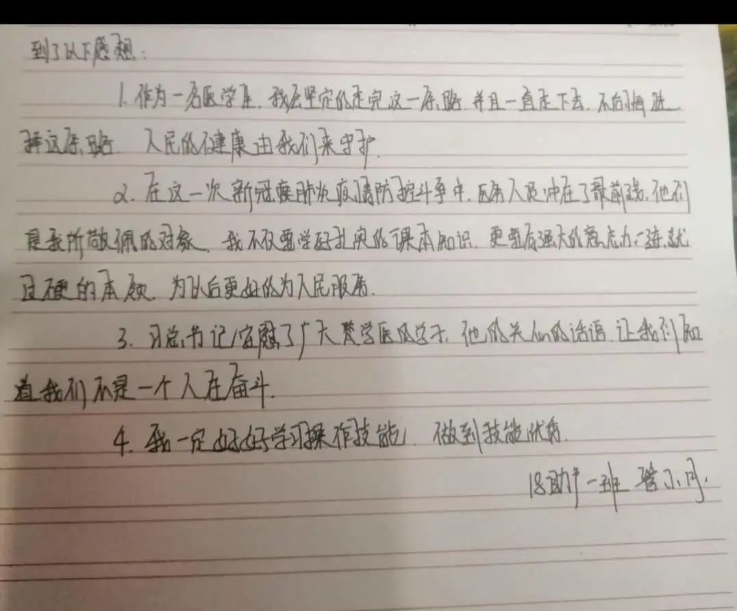 从抗疫一线到社区防控,在疫情防控的各个环节,各个岗位,尽职尽责,勇于创新,全力奋战,把爱国情付诸实际行动,为夺取疫情和经济社会发展“双胜利”奉献青春活力。18级护理新疆班陈静同学说:“年轻的脸庞朝气蓬勃,青春的力量一往无前。光阴似箭,日月如梭,还有几个月我们就要回到新疆走向实习的岗位,在这期间我们会珍惜在学校学习的美好时光,认真学习理论知识,熟练掌握各项技能,为几个月后的实习打下牢固的基础。在今后的护理工作中,我们也会严格要求自己遵守医院的各项规章制度,虚心向带教老师及各位护理前辈学习,不断提升自己。”