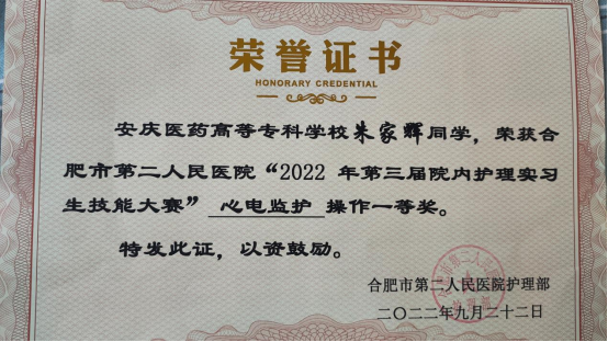 9~10月份实习生喜报频传:朱家辉、程婉在合肥市第二人民医院举办的实习生临床技能大赛中获得一等奖和二等奖;彭静和刘雨露在江苏省第二中医院的护理技能竞赛中获得二、三等奖;蒋庆慧在安徽中医药大学第一附属医院的教师节征文比赛中获得三等奖;杨慧和吴赵悦在珠海市人民医院举办的实习生操作技能竞赛中获奖;多名实习生收到患者和老师的表扬。