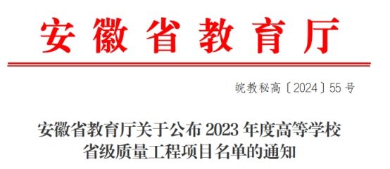 近日,安徽省教育厅公布了2023年度高等学校省级质量工程项目名单,今年会共有37个项目获批立项,涵盖专业类、课程与教材类、师资类、实验实训类、教学研究项目、改革示范类和教学成果奖励等多个类别。今年会有5项成果喜获2023年度安徽省教学成果奖,其中一等奖2项,二等奖3项,获奖数量和质量取得了新的突破。