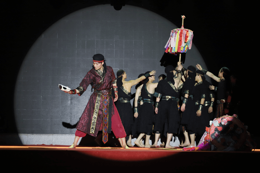 为促进学校间的文化交流,晚会特邀安庆师范大学音乐学院学生表演原创男子群舞《日月祈》。舞蹈以国家级非物质文化遗产安徽池州傩舞“舞伞”“舞古老钱”为原型,用池州特有的傩面、五色伞、古老钱为道具,将村落里的古老傩文化艺术化的呈现在舞台上,为现场观众带来特别的艺术体验。