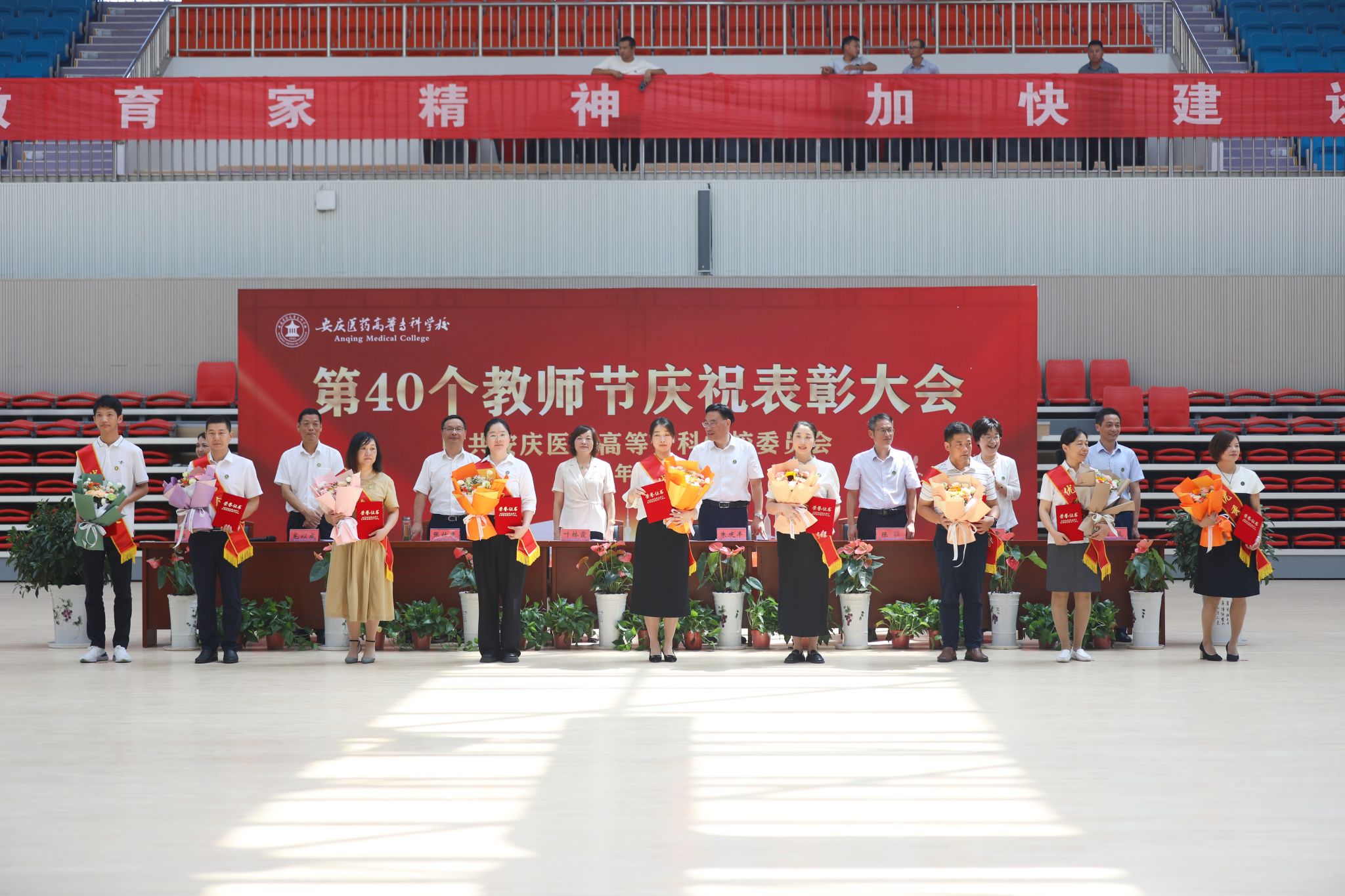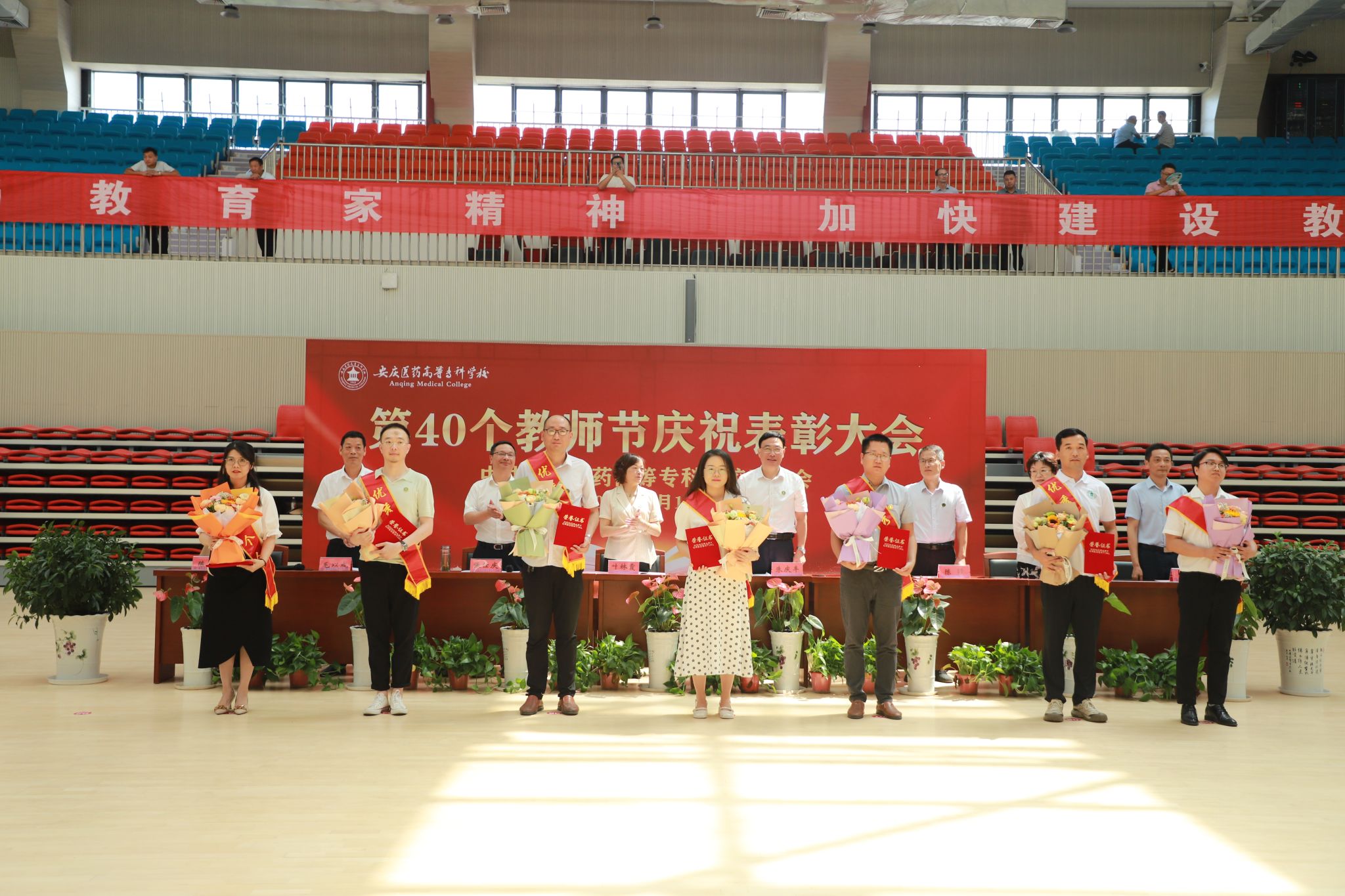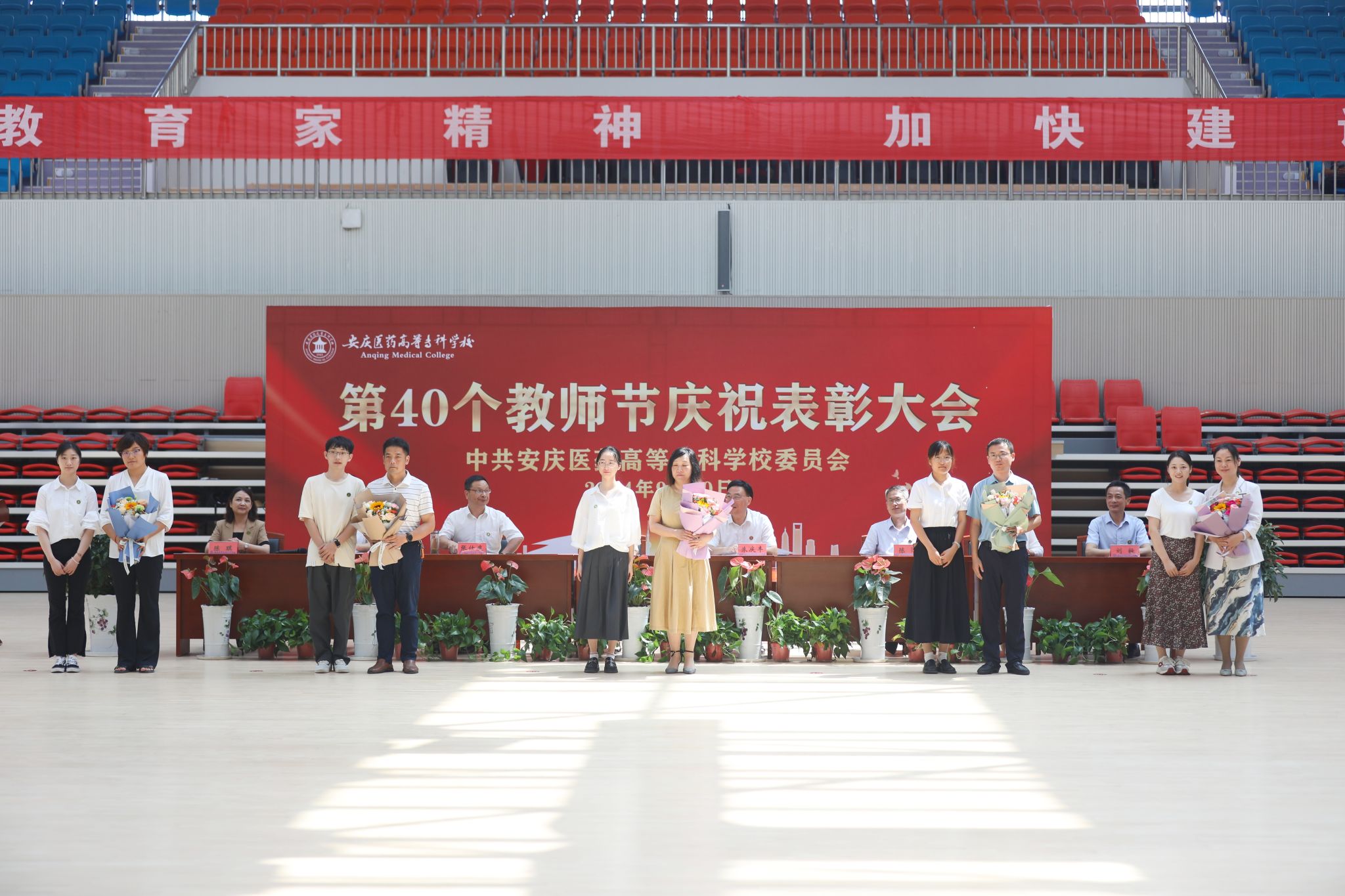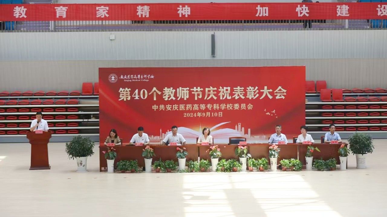 9月10日上午,以“大力弘扬教育家精神,加快建设教育强国”为主题的第40个教师节庆祝表彰大会在学校新建成的百花亭体育馆隆重举行。安徽省安庆市人大常委会副主任叶林霞、全体校领导班子出席会议。大会由校党委副书记张仕庆主持。