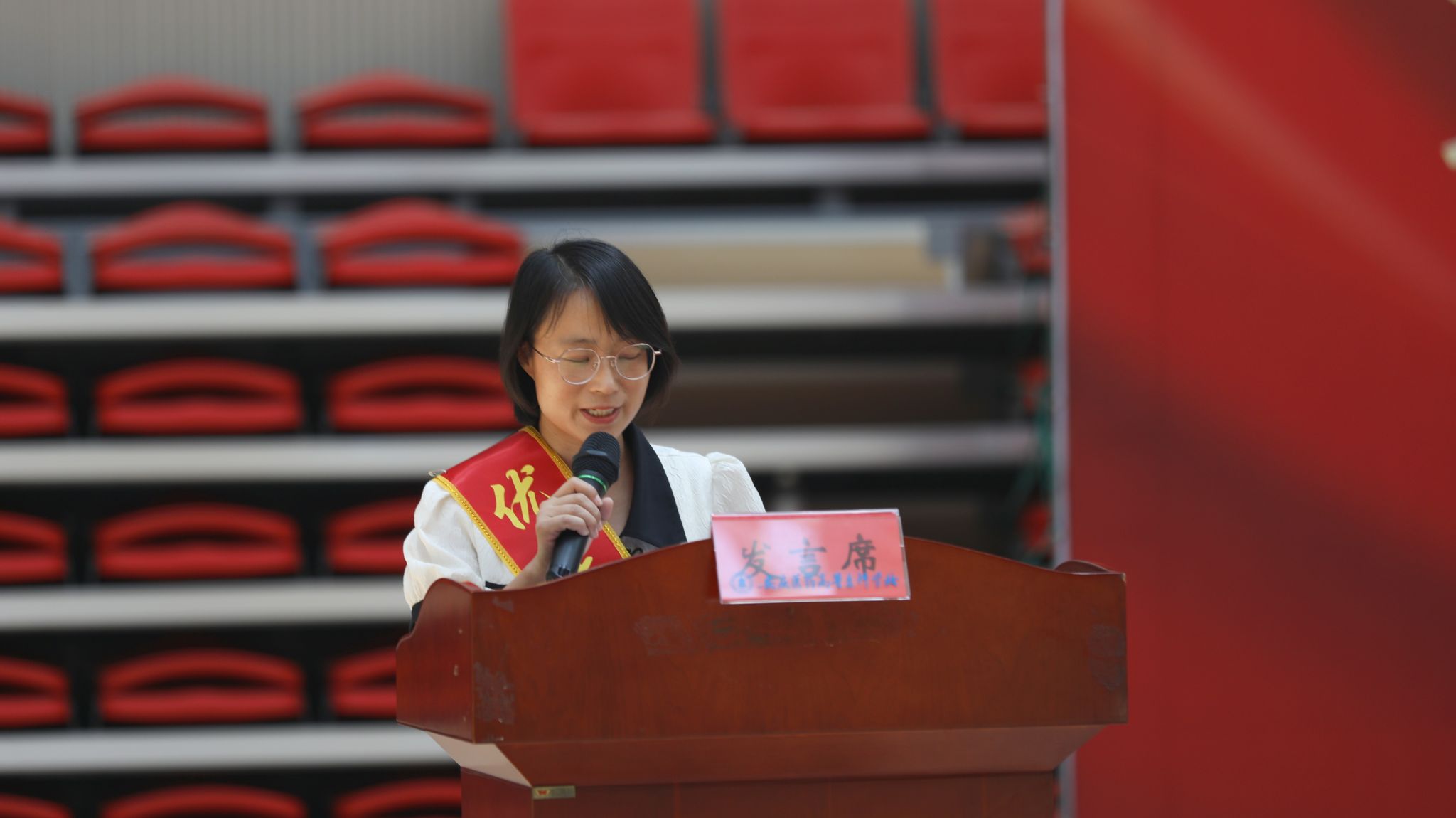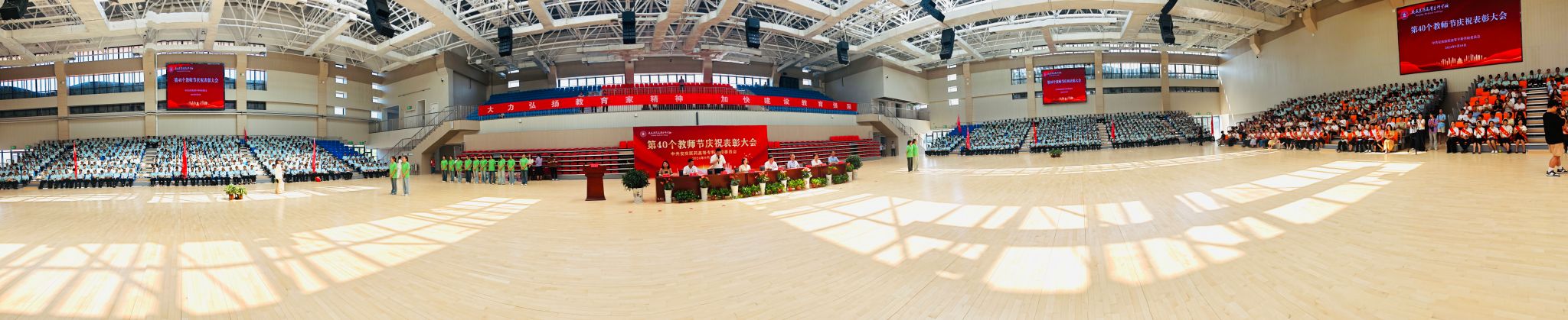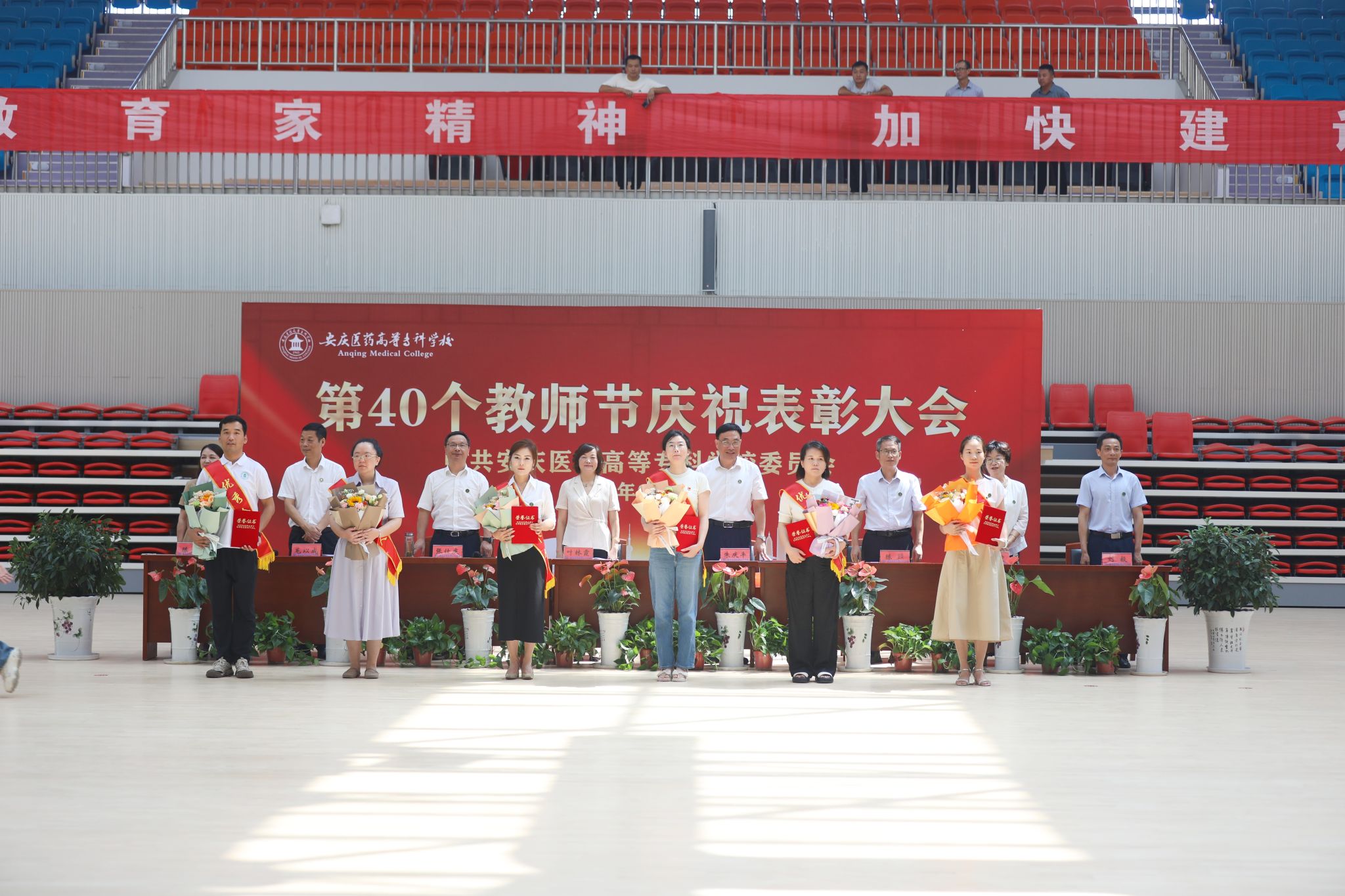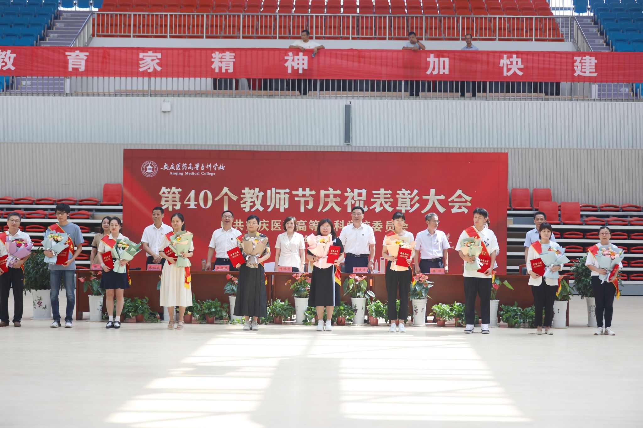 9月10日上午,以“大力弘扬教育家精神,加快建设教育强国”为主题的第40个教师节庆祝表彰大会在学校新建成的百花亭体育馆隆重举行。安徽省安庆市人大常委会副主任叶林霞、全体校领导班子出席会议。大会由校党委副书记张仕庆主持。