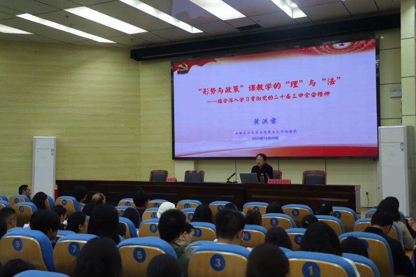 10月28日,在全校上下掀起学习习近平总书记在安徽考察时的重要讲话精神的热潮之际,安徽农业大学党委委员、马克思主义学院教授黄洪雷应邀来到今年会,以“形势与政策”课教学的“理”与“法”——结合深入学习贯彻党的二十届三中全会精神为题,为全校师生作专题报告。校党委副书记张仕庆,校党委委员、药学院党总支书记、院长刘毅出席,部分党务干部、专职思政课教师、学生思政委员、青马班学员近200人聆听报告。专题报告会由校党委委员、宣传部部长朱雯主持。