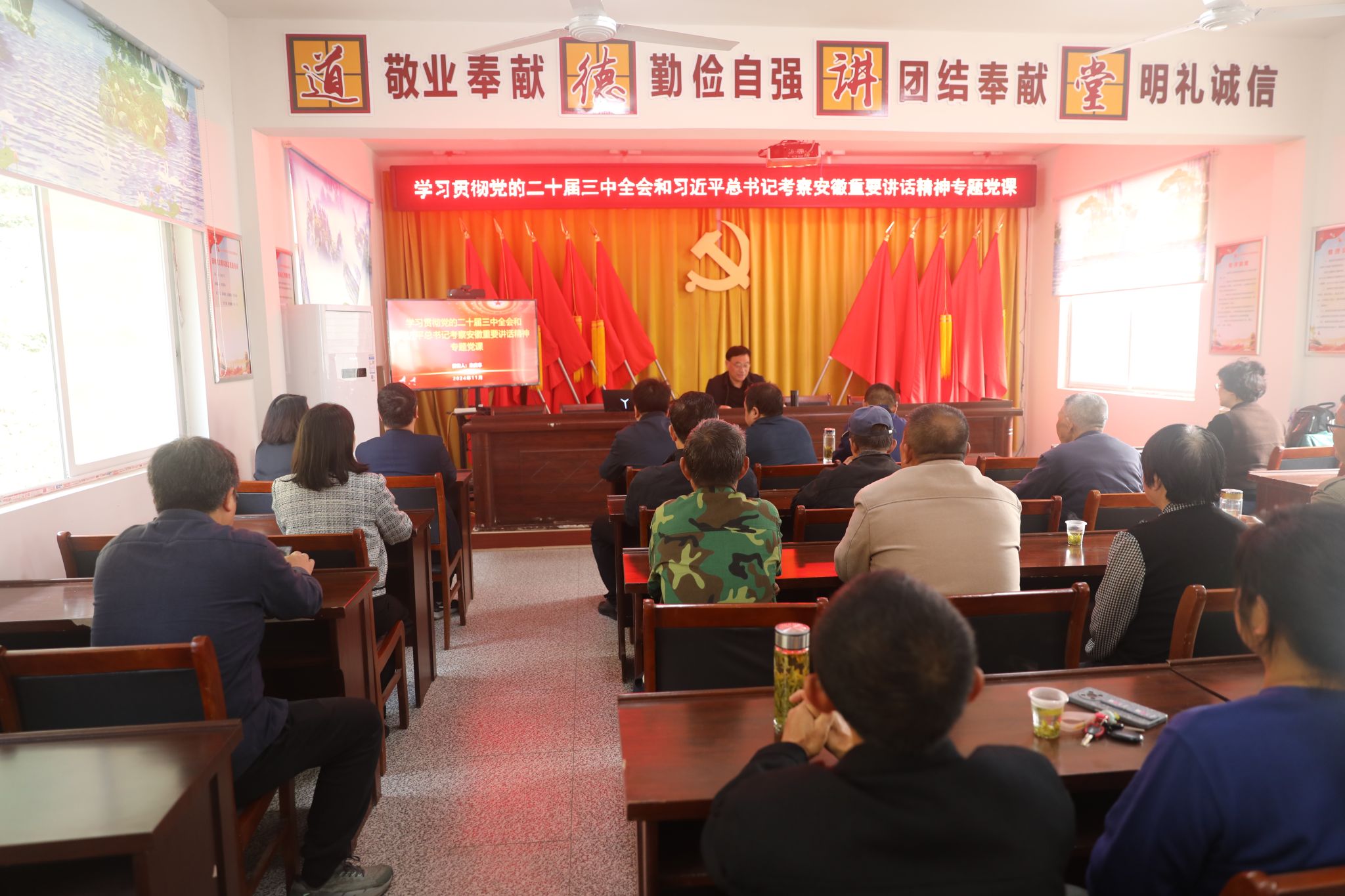 在村部党员活动室,朱庆丰为龙河村全体党员上专题党课,紧密围绕党的二十届三中全会精神核心要义,结合习近平总书记考察安徽重要讲话精神,深入浅出地解析了新时代党的使命任务、乡村振兴战略以及加强基层党组织建设的重要性。