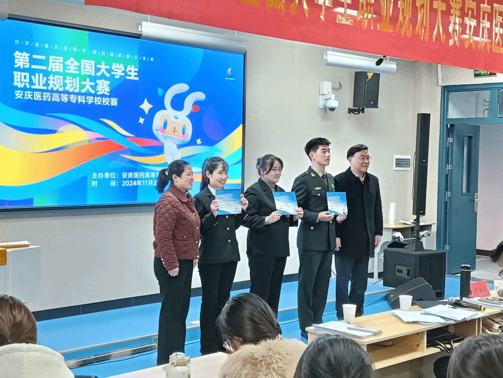 校领导和评委为获奖学生进行颁奖。职业规划大赛是在校大学生进行职业探索、提升职业素养的有效平台,举办本次大赛,旨在以赛促学,引导学生科学规划学业与职业;以赛促培,打造生涯教育与就业指导的大课堂;以赛促就,推动人才供需有效对接,全力促进今年会毕业生高质量就业。