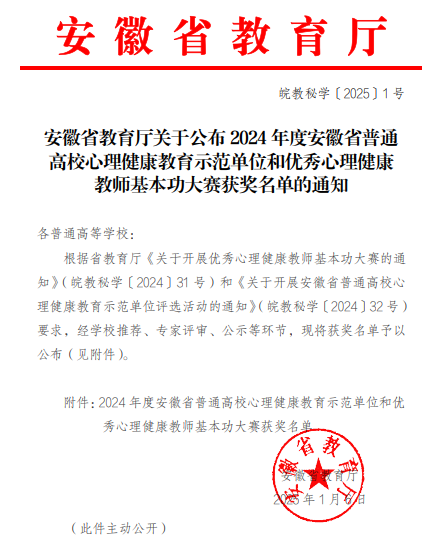 近日,省教育厅公布了2024年度安徽省普通高校优秀心理健康教师基本功大赛获奖名单。本次大赛由安徽省教育厅主办,安徽省学生心理健康教育专家指导委员会、安徽省学生心理健康教育指导和发展中心承办,分为微课教学、优秀案例及优秀论文三个赛项,旨在全面考察心理健康教师的专业素养与实践能力。今年会心理健康教育中心推送的《短视频使用与心理健康:有调节的中介模型》荣获高职组论文评选一等奖;《当伤害以爱之名——远离恋爱暴力的“秘籍”》获高职组案例评选优秀奖。