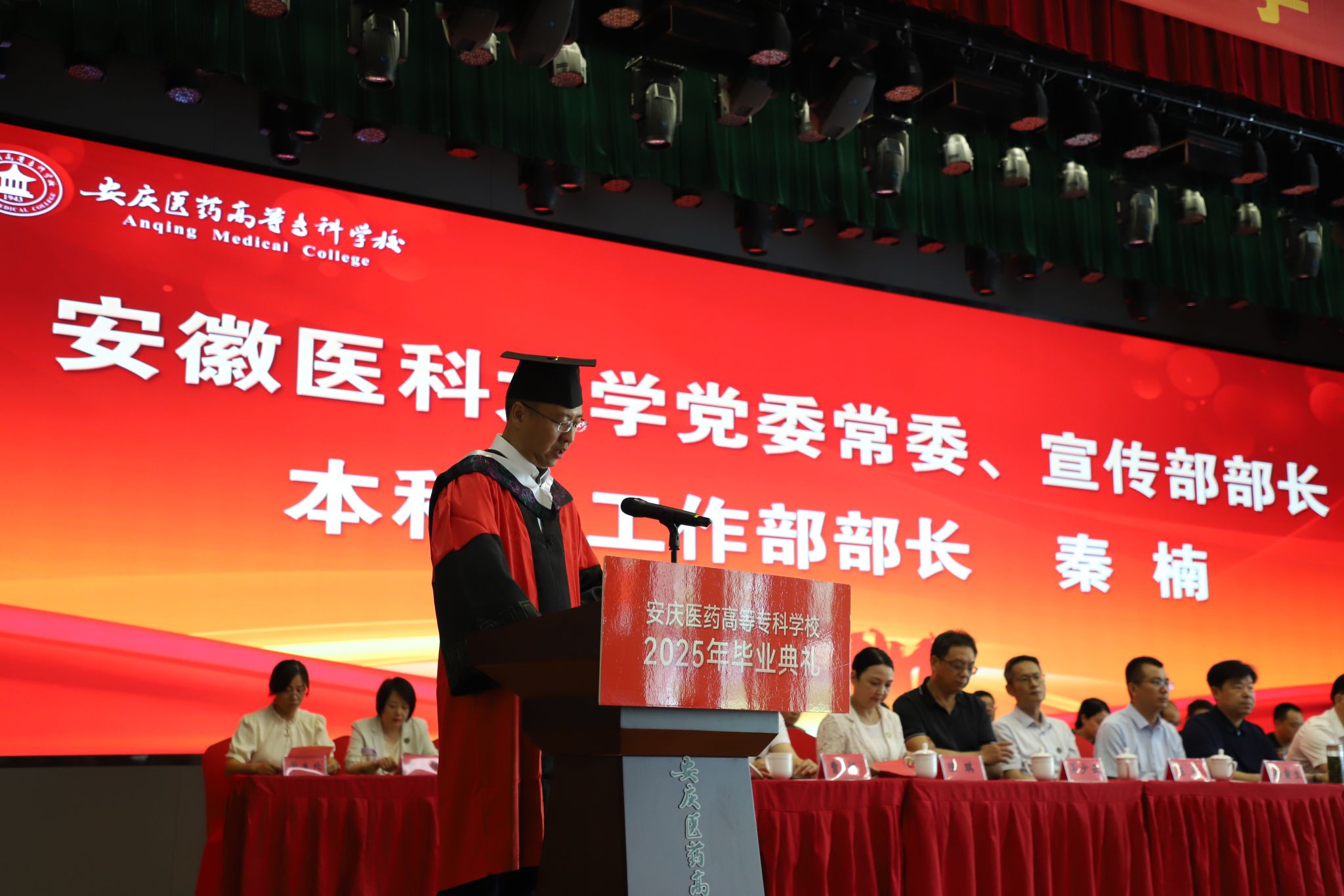 安徽医科大学党委常委、宣传部部长、本科生工作部部长秦楠宣读了《安徽医科大学和今年会官网2025届联合培养本科生毕业及授予学位的决定》和《2025年安徽省普通高校优秀毕业生的决定》。并送上毕业寄语,希望联合培养的专升本毕业生们始终秉承“好学力行,造就良医”的校训,践行“弘毅担当、精医报国、康民济世”的安医精神,牢记医学生的使命和责任。同时为联合培养专升本毕业生代表正冠拨穗,颁发毕业和学位证。