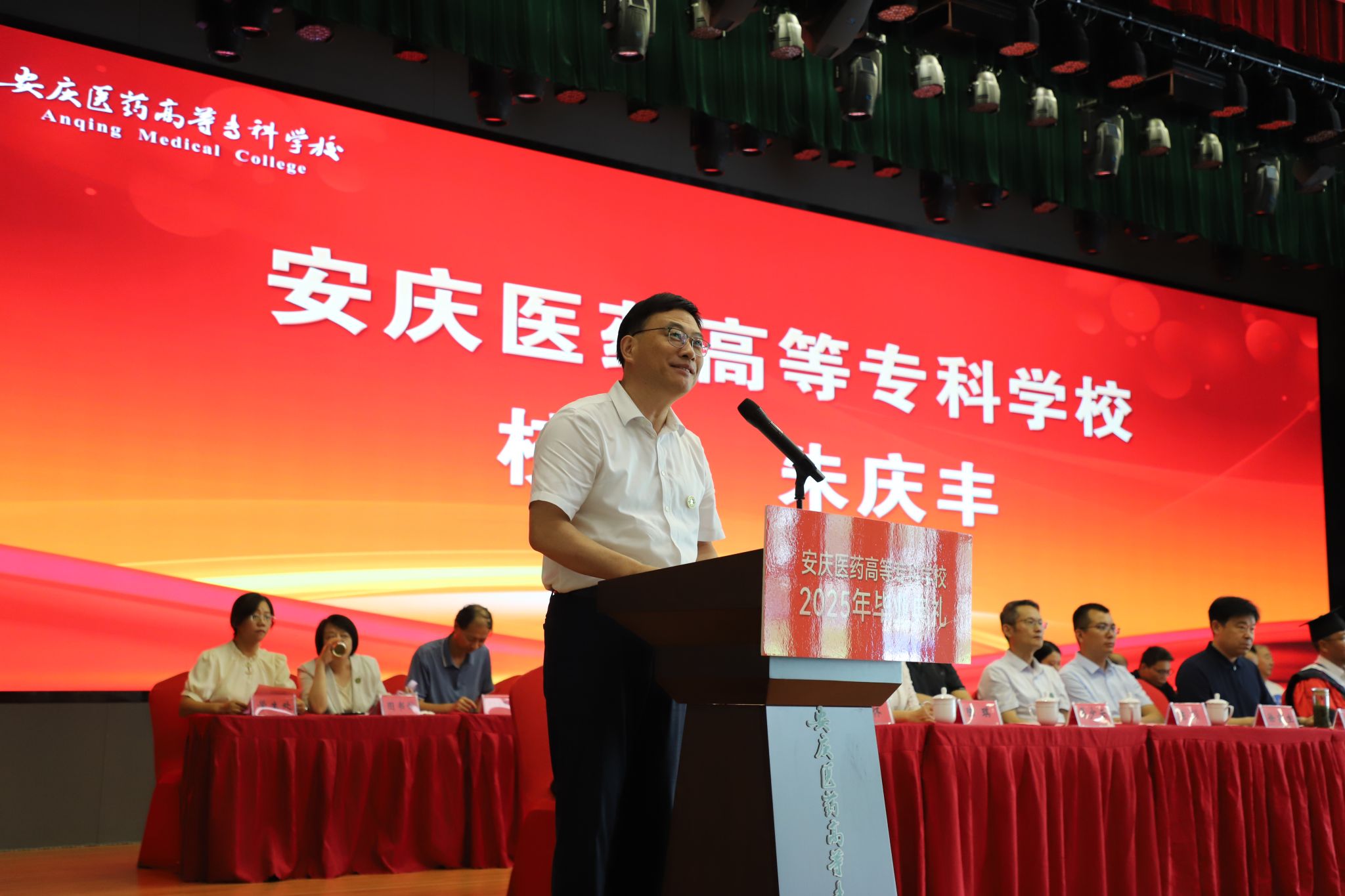 校党委副书记、校长朱庆丰代表学校全体师生医护员工向毕业生们表示热烈的祝贺和美好的祝愿。回顾了三年来同学们如何用实际行动诠释了“仁心筑梦,妙术启航”的深刻内涵,用坚定的信念不断追求学术梦想。他向毕业生提出三点希望,一是永葆仁爱之心。面对患者,要始终以同理心对待他们的病痛与焦虑,用温暖的话语、贴心的服务,传递医学的温度。二是坚守专业之责。医学知识日新月异,疾病谱不断变化,只有持续学习、终身学习,才能紧跟时代步伐。三是勇担时代之任。要主动融入国家发展大局,积极投身公共卫生事业、基层医疗建设等领域,用青春和热血,在守护人民健康的战场上,书写无愧于时代的答卷。