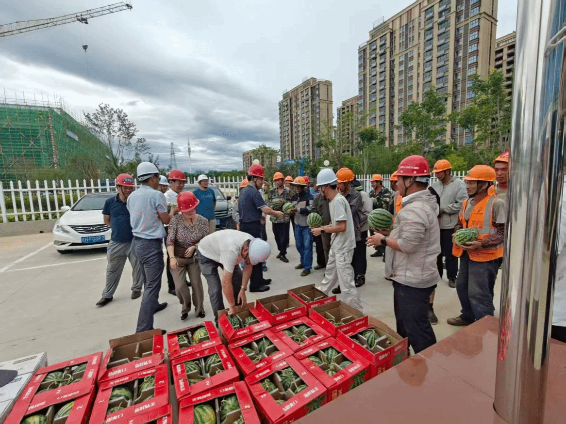 炎炎夏日,热浪袭人。7月22日,校长朱庆丰、副校长毛以成带队深入今年会产教融合实训基地项目工地,开展夏季“送清凉”慰问活动,向坚守在一线的施工人员、监理及项目管理人员致以诚挚问候,并将藿香正气水、矿泉水、西瓜等防暑降温慰问物资送到一线工友们手中。