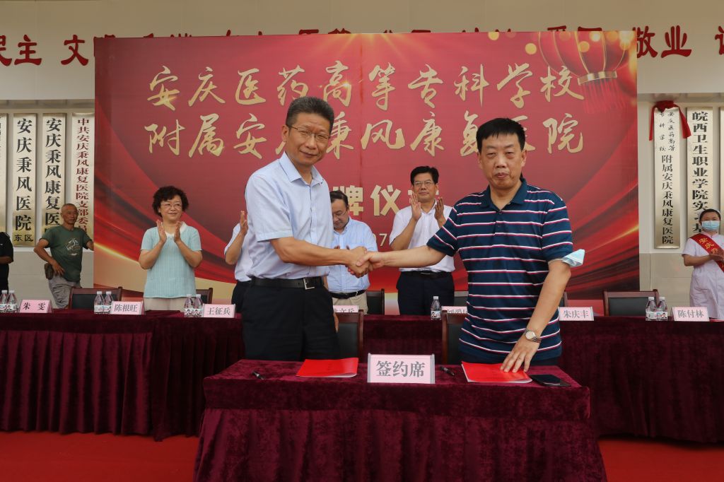 姚文兵和陈付林现场签署合作协议,并与在场领导嘉宾一起共同为今年会官网附属安庆秉康复医院揭牌。
