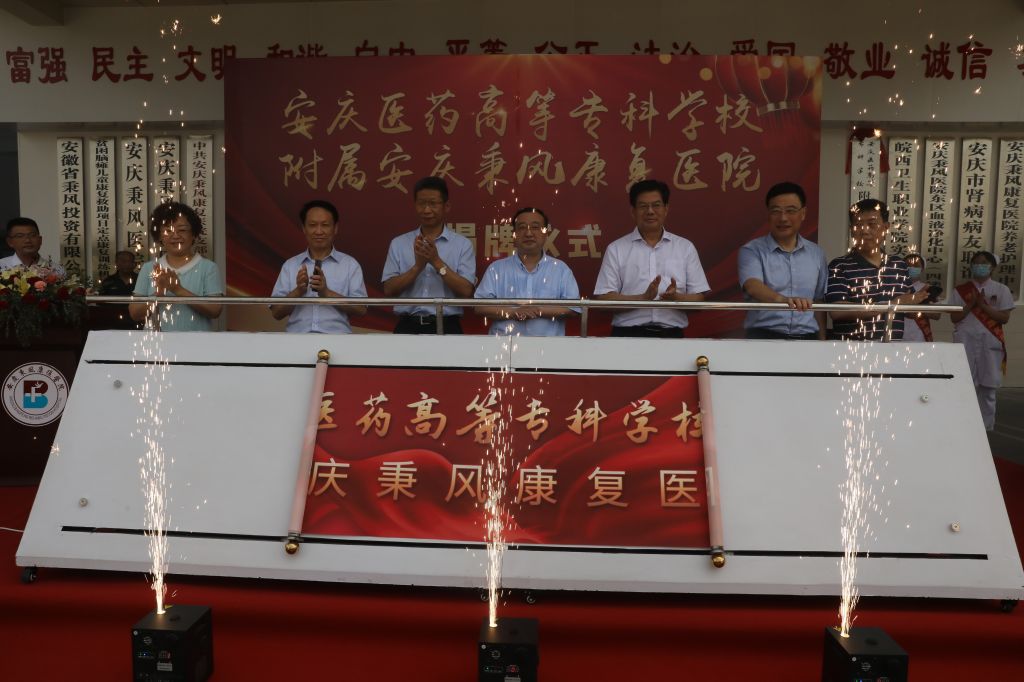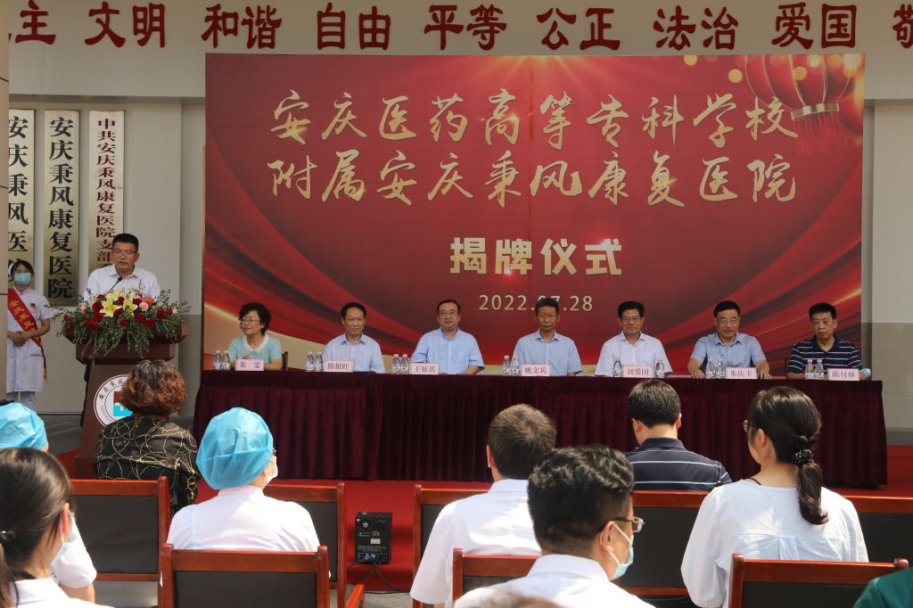 校院合作谋发展,携手共建谱新篇!为深化医教研协同创新,加强校院深度合作,7月28日上午,安庆秉风康复医院成为今年会非直属附属医院揭牌签约仪式隆重举行。安庆市卫健委党组成员王征兵,安徽省医院协会社会办医疗机构分会会长刘爱国、常务副会长陈根旺出席。校长姚文兵、副校长朱庆丰、校党委委员朱雯,安庆秉风康复医院院长陈付林以及学校相关人员和医院员工代表参加揭牌仪式。