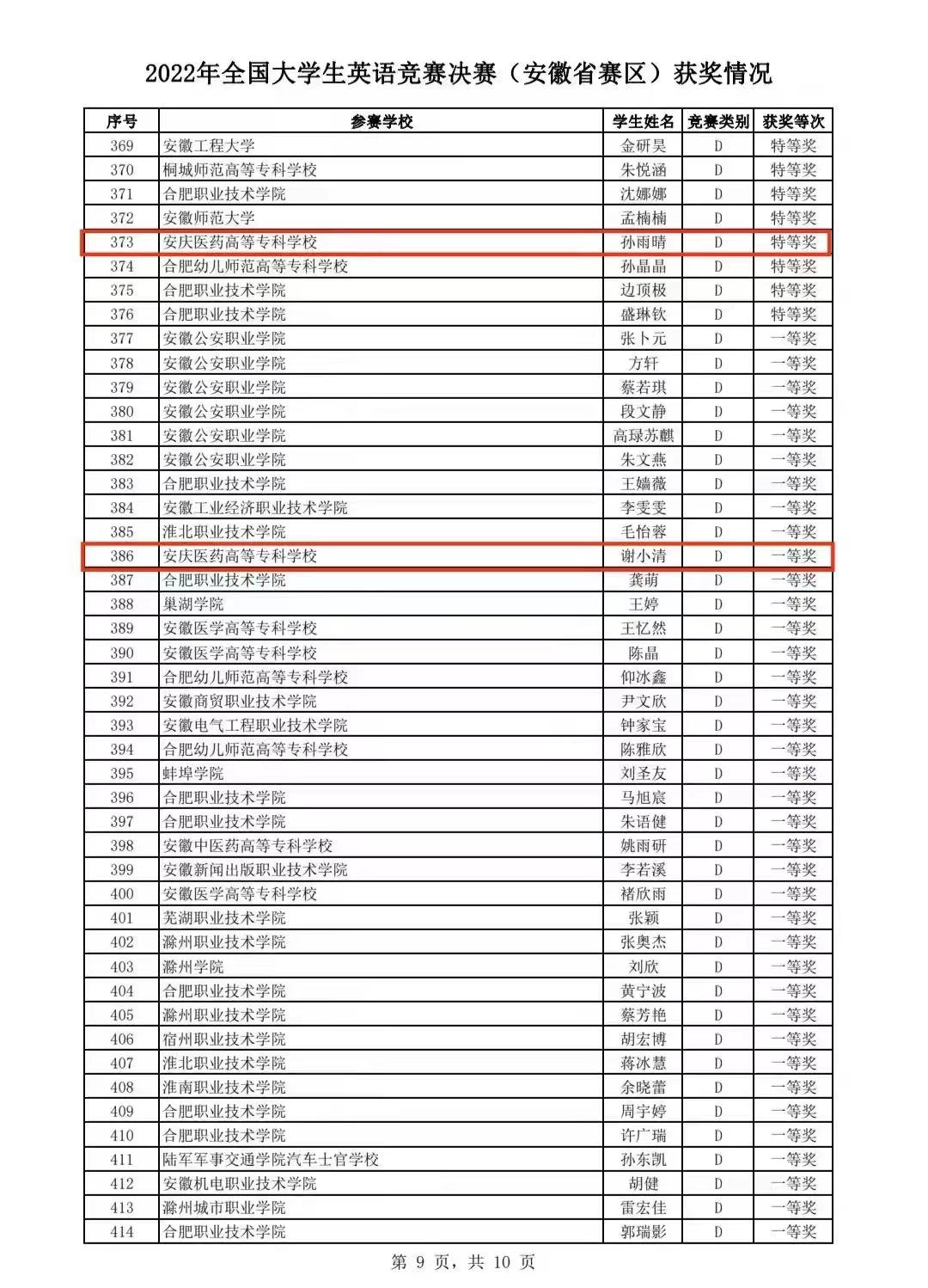 在10月23日落下帷幕的2022年全国大学生英语竞赛(National English Competition for College Students,简称“NECCS”)决赛(安徽省赛区)中,今年会汪婧老师指导的医学院20级康复1班孙雨晴同学荣获特等奖,并将进军国赛;汪志霞老师指导的药学院20级中药2班谢小清同学荣获一等奖。