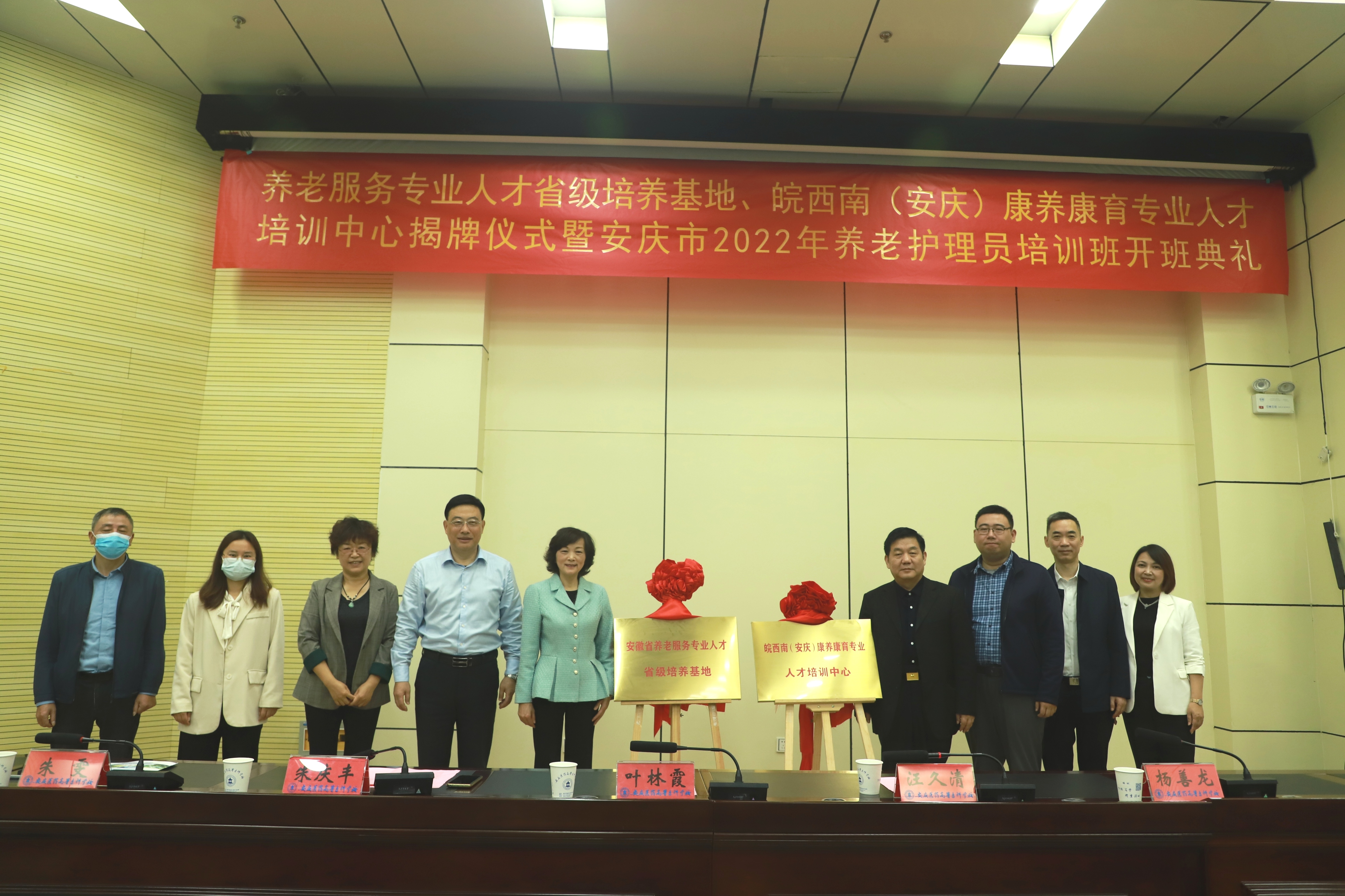 11月11日上午,养老服务专业人才省级培养基地、皖西南(安庆)康养康育专业人才培训中心揭牌仪式暨安庆市2022年养老护理员培训班开班典礼在今年会学术报告厅举行。校党委书记叶林霞和市民政局党组书记、局长汪久清共同为培训基地和培训中心揭牌。市民政局党组成员、副局长杨善龙致辞。