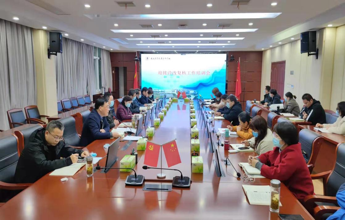 11月29日上午,学校在行政楼大会议室举办迎接诊改复核工作线上线下培训会。校党委书记叶林霞,校长姚文兵等党政班子全体成员出席会议,各部门负责人及副职、三级部门负责人、诊改五层面负责人、6个专业12门课程负责人,各学院教研室主任、专业负责人和参与诊改复核专家访谈的教师代表参加了会议。