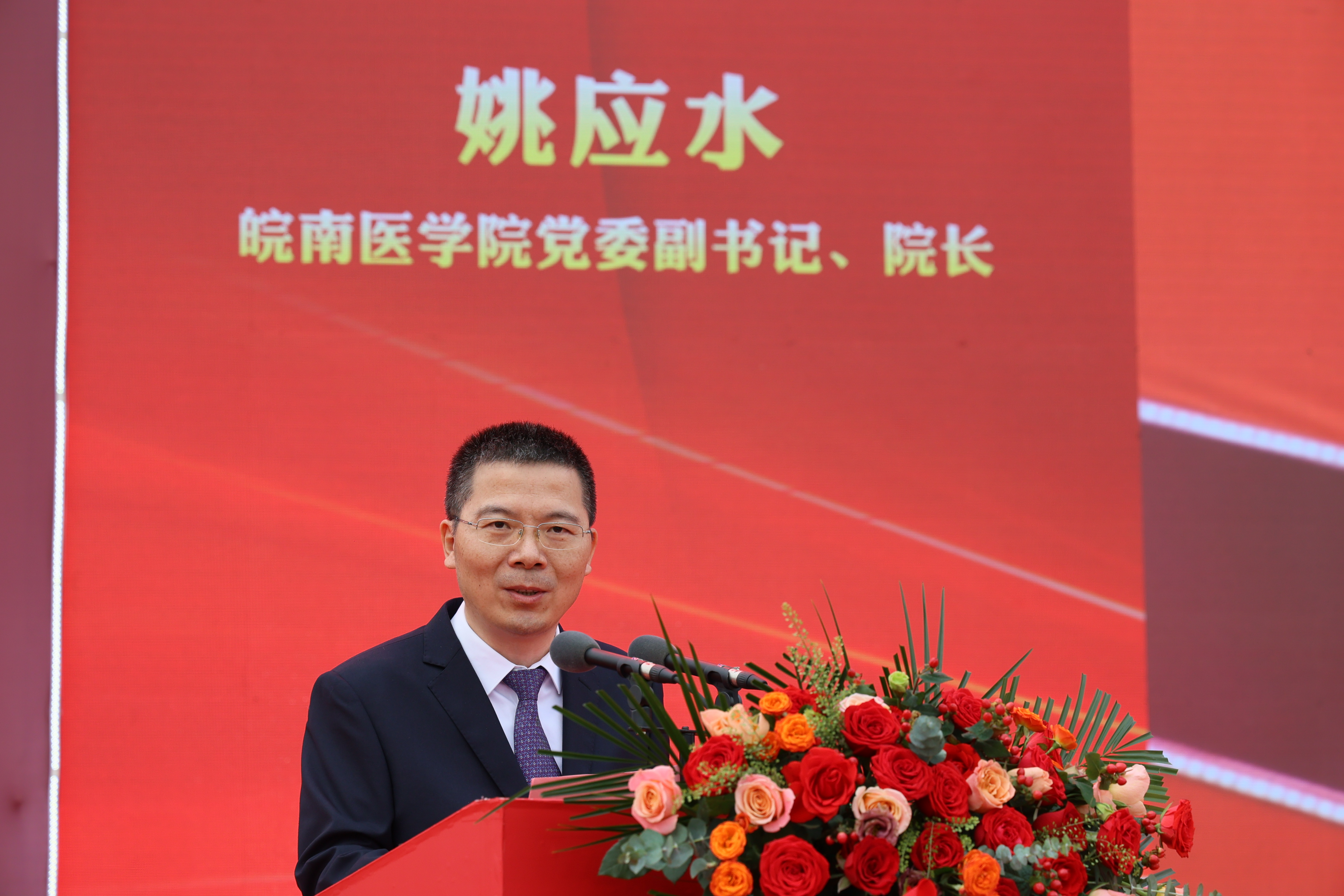 友好学校代表,皖南医学院党委副书记、院长姚应水致辞,代表皖南医学院向学校建校80周年表示热烈祝贺。他指出,安庆医专在80周年的办学历程中,立足地方办学,凸显优势特色,在学科专业建设、医卫人才培养、教育教学科研、服务经济社会发展等方面取得了骄人的成绩、良好的发展状态和迅猛的上升态势。两校在办学历史、文化底蕴、发展目标等方面上有着很深的渊源,经过两校一代代人薪火相传、无私奉献,为事业发展奠定了坚实的基础。在建设健康中国、教育强国战略中,皖南医学院将和安庆医专手牵手、肩并肩,同向同行,同频共振,以扎实的办学实力和突出的办学业绩为教育强省建设、服务人民生命健康做出新的更大贡献,衷心祝愿安庆医专在未来行稳致远,再创辉煌。