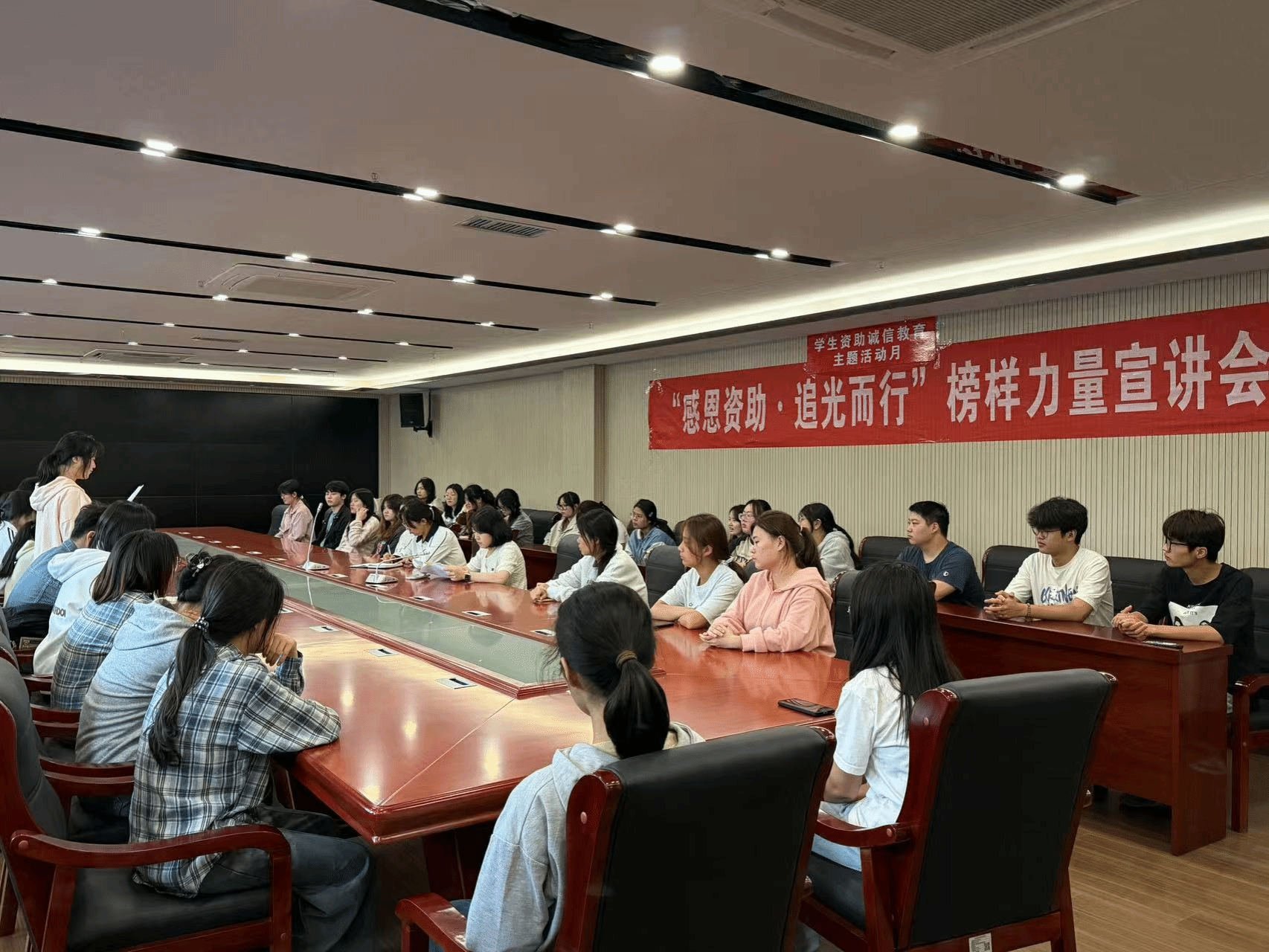 为学习宣传今年会资助诚信教育典型人物,推动和深化资助育人工作。今年会举办“感恩资助·追光而行”榜样力量宣讲会。此次宣讲会邀请各类大赛获奖学生及励志奖学金获得者,分享他们的学习态度和人生态度,通过讲述自立自强的励志实际,分享学习经验、备赛经验、实习经验等,激励朋辈勇于进取、刻苦努力,充分发挥榜样引领力量。