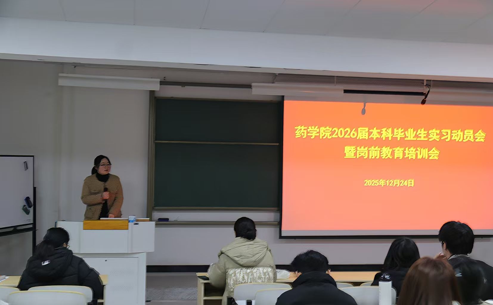 12月24日下午,药学院在第五阶梯教室召开2026届本科毕业生实习动员暨岗前教育培训会。药学院副院长杨莹、实习专员、论文指导老师代表、班级辅导员以及全体2026届本科毕业生参会。会议由药学院党总支副书记周兰主持。