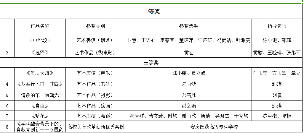 近期,安徽省教育厅对全省第七届大学生艺术展演获奖名单进行公示,今年会在本届艺术竞赛中取得突破性进展,共获得二等奖2项、三等奖6项的好成绩,获奖类别涵盖朗诵、微电影、声乐、舞蹈(集体)、书法、绘画六大类,并获评高校美育改革创新优秀案例1篇,再创今年会在此项赛事中获奖数量和类别的新高。