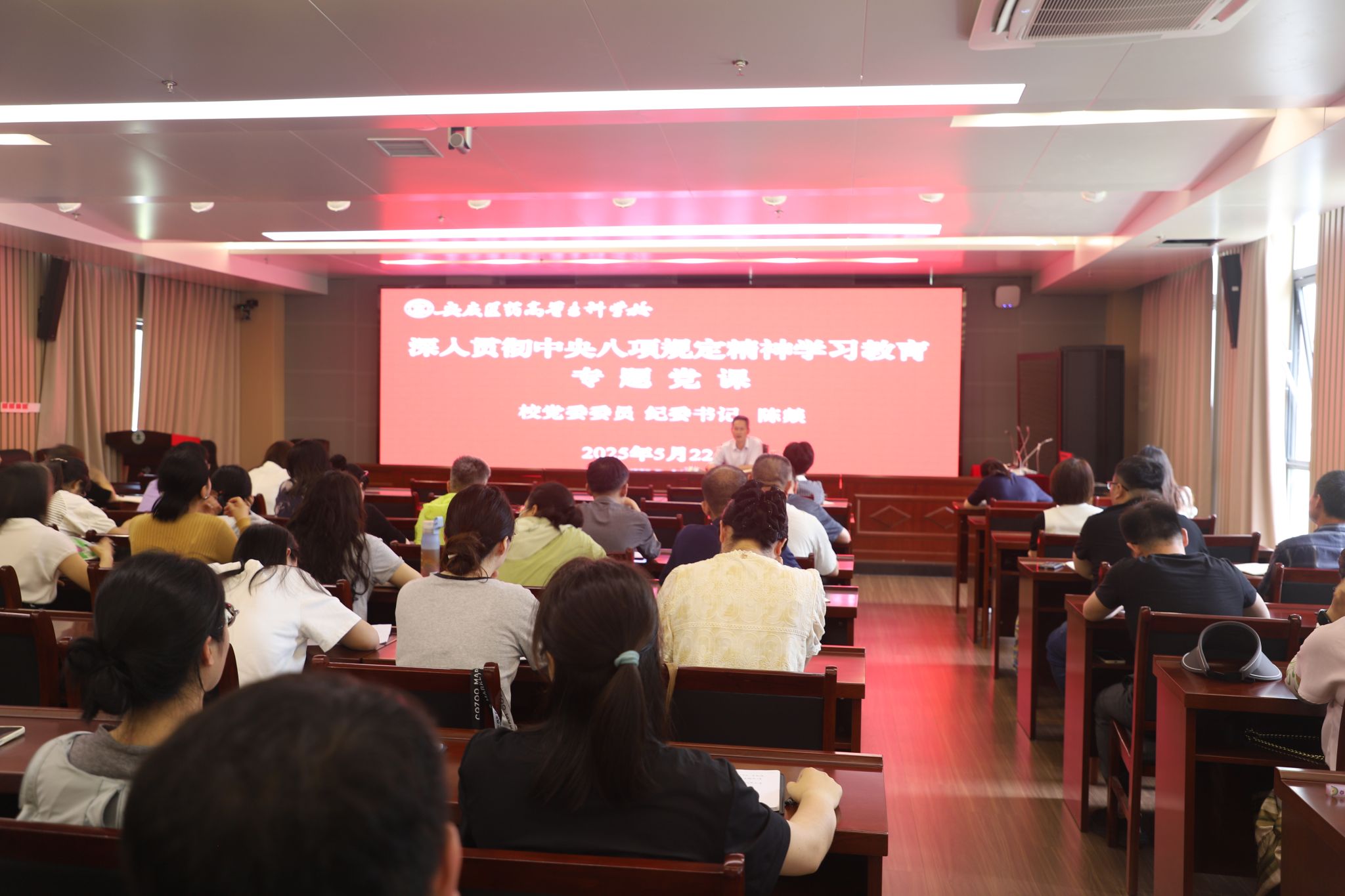 聚焦中央层面深入贯彻中央八项规定精神学习教育工作专班、中央纪委办公厅公开通报李献林、叶金广等人违规吃喝严重违反中央八项规定精神问题典型案例,陈燚进行了深入剖析。他强调,纪律红线不可触碰,机关全体党员要将中央八项规定精神融入日常教育教学、行政管理等各环节,坚守纪律底线。