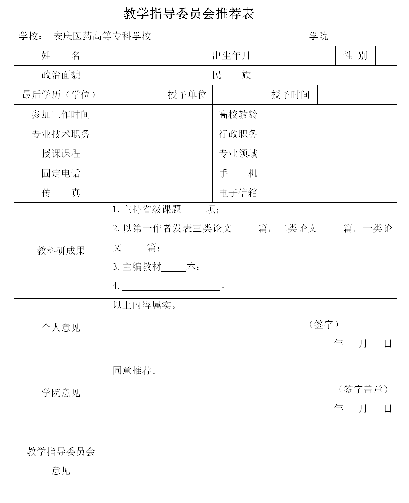 二、请个人填写申请表(附件1),每个学院推荐1-2名(尽量不与学术委员会成员重复),将申请表以学院为单位,纸质版一式两份2月13日前交教务处215。