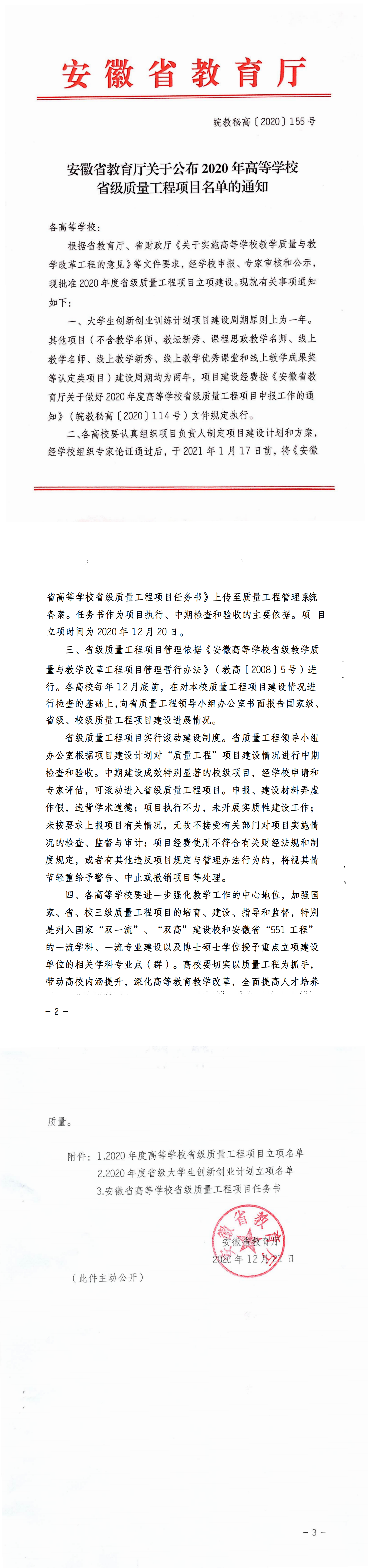 安徽省教育厅关于公布2020年高等学校省级质量工程项目名单的通知