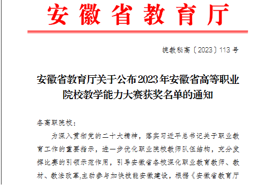 日前,由安徽省教育厅举办的2023年安徽省高等职业院校教学能力大赛获奖名单发布,今年会夺得二等奖1项、三等奖2项,实现学校教学能力比赛历史最佳成绩。