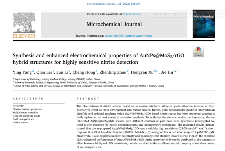 今年会药学院杨莹老师在《Microchemical Journal》(中科院分区2区)发表了题为《Synthesis and Enhanced Electrochemical Properties of AuNPs@MoS2/rGO Hybrid Structures for Highly Sensitive Nitrite Detection》的研究论文(DOI:10.1016/j.microc.2021.106904)。