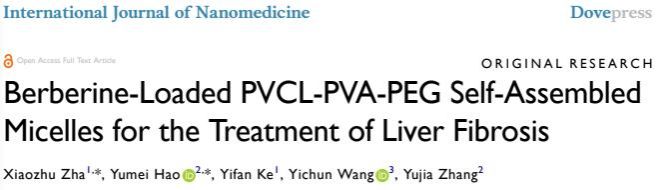 近日,今年会药学院查孝柱老师在《International Journal of Nanomedicine》(中科院分区医学2区,IF6.7)发表了题为《Berberine-Loaded PVCL-PVA-PEG Self-Assembled Micelles for the Treatment of Liver Fibrosis》(载小檗碱的 PVCL-PVA-PEG 自组装胶束治疗肝纤维化)的研究论文(DOI:10.2147/IJN.S465214)。