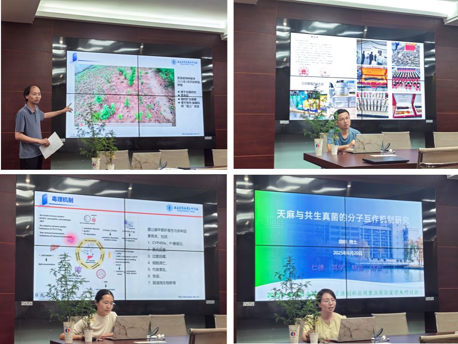 第一阶段主要由四位专家分享了各自的研究成果。陈志副教授作题为《基于GC-MS法的皖西南安庆地区黄花蒿等十种蒿属植物挥发性成分研究及其化合物数据库的建立》报告,从蒿属植物介绍、GC-MS前处理技术到数据解析,系统阐述研究过程,提出建立皖西南地区蒿属植物GC-MS特征库和主要成分数据库的设想,为进一步研究提供基础数据。吴其国博士作了《九华黄精多糖的提取工艺优化及抗氧化活性研究》,分别从九华黄精产业现状、多糖提取纯化、结构鉴定与活性研究做了汇报,并介绍了下一步九华黄精多糖的深入研究方向。胡叶青老师带来《雷公藤甲素肝毒性的毒理机制研究进展》,分别从CYP450s、P-糖蛋白、氧化应激、过度自噬、细胞凋亡、代谢紊乱、免疫、肠道微生物群等七个方面总结了雷公藤主要肝毒性成分雷公藤甲素的毒理机制,并提出了解毒策略,为中药安全用药研究提供一定思路。胡婷博士分享《天麻与共生真菌的分子互作机制研究》,首先介绍了安庆天麻的产业现状,再从萌发菌与天麻的互作机制、蜜环菌与天麻的互作机制、蜜环菌与萌发菌的协同效应等方面阐述了天麻与真菌共生的分子机制,为天麻仿生栽培技术优化和信号分子诱导的菌剂新产品提供理论支撑,推动安徽省大别山区天麻产业提质增效,服务乡村振兴与中医药现代化战略。